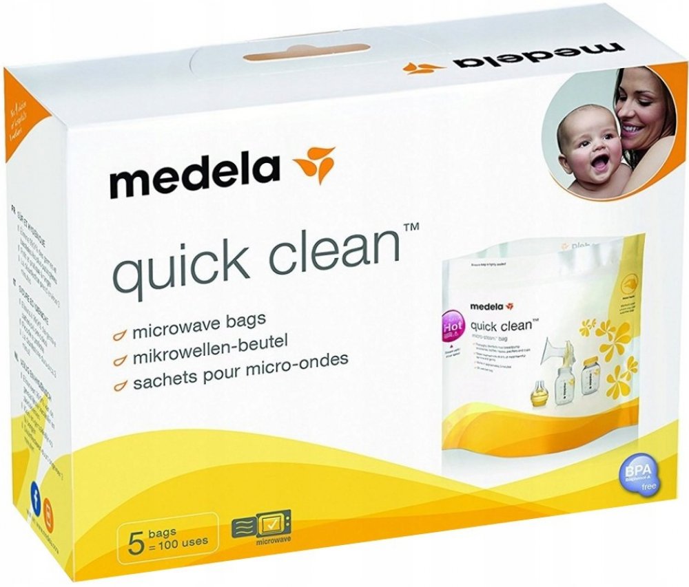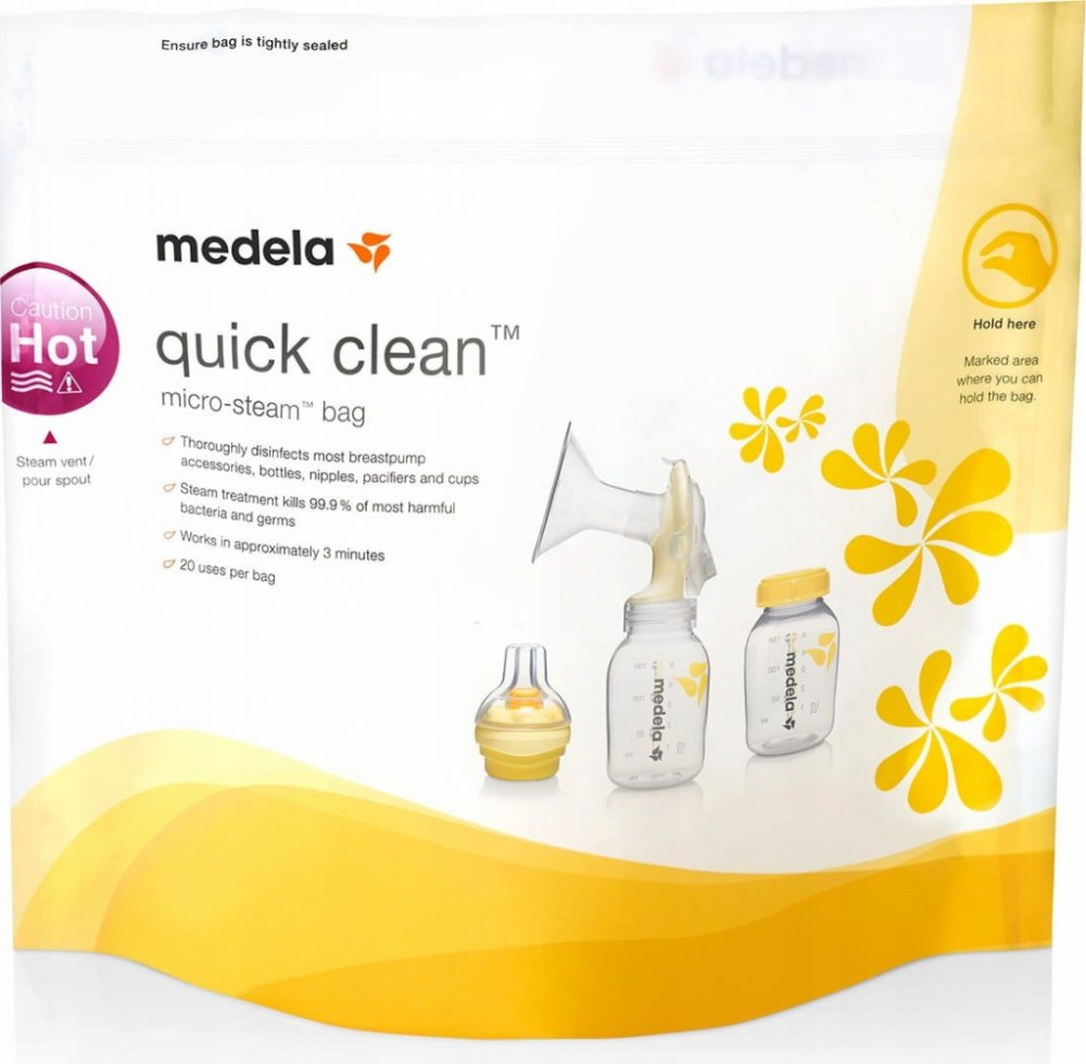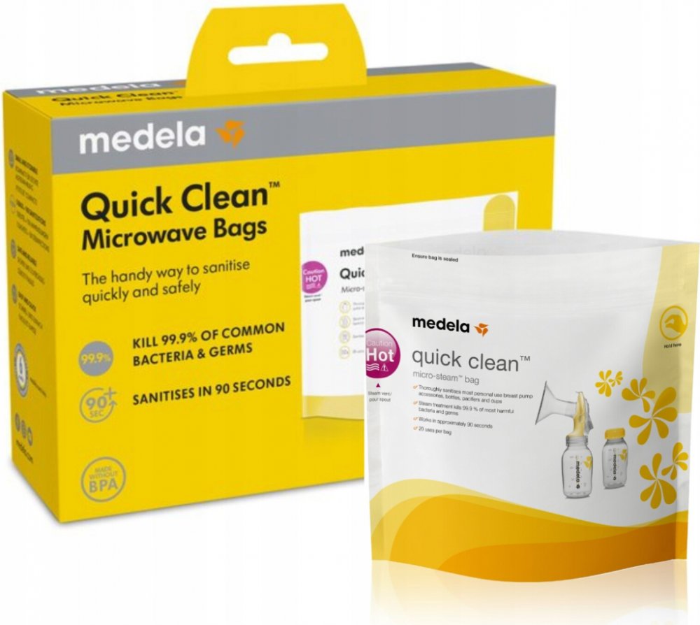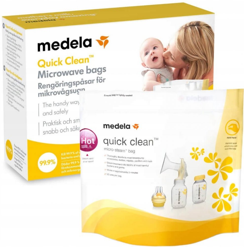 Bezpečné, rychlé a praktické: Díky sáčkům Medela Quick Clean pro dezinfekci v mikrovlnné troubě lze příslušenství podporující kojení dezinfikovat již za tři minuty. Takové řešení je nejen rychlejší a jednodušší než vaření, ale také umožňuje odstranit 99,9 % nejškodlivějších bakterií a ch...