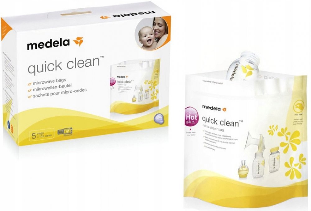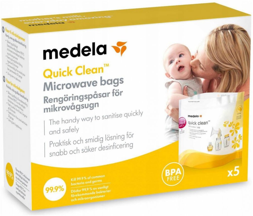 Bezpečné, rychlé a praktické: Díky sáčkům Medela Quick Clean pro dezinfekci v mikrovlnné troubě lze příslušenství podporující kojení dezinfikovat již za tři minuty. Takové řešení je nejen rychlejší a jednodušší než vaření, ale také umožňuje odstranit 99,9 % nejškodlivějších bakterií a choroboplodných zárodků.
