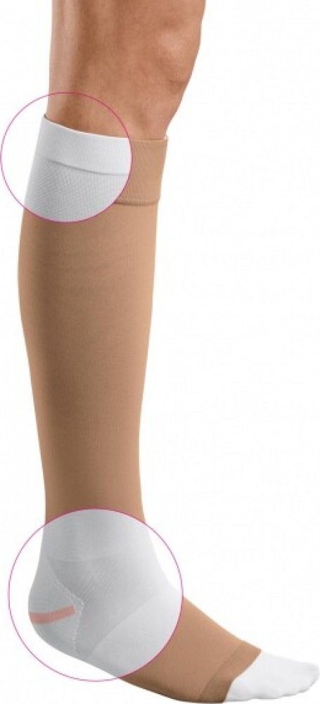 mediven ulcer kit je systém dvou kompresivních punčoch oblečených na sobě a zaručujících terapeutický tlak 20 + 20 mm Hg. Souprava je využívána k ošetřování vředů na nohou (ulcus cruris venosum) a obsahuje: 2 kusy lýtkových punčoch mediven ulcer s plnou špičkou 1 kus lýtkové punčochy mediven ulcer plus (se špicí) Vnitřní (základní) lýtková punčocha mediven ulcer s tlakem 20 mm Hg (v oblasti nad kotníkem) je koncipována k permanentní kompresi během dne i noci. Se dvěma kusy punčoch mediven ulcer bude mít pacient vždy náhradní punčochu pro případ, když se první punčocha právě pere (nejlépe při teplotě 95 °C). Tímto je zajištěna nepřetržitá kompresivní terapie. bílá barva, pouze ve variantě s uzavřenou špicí plochý lem drží pevně na místě a nezařezává se jemný materiál s antibakteriálním účinkem pro příjemný komfort při nošení a snadné nasazování zjemněná nártová část pro optimální padnutí a snížení tvorby záhybů, když je chodidlo ohnuté speciální konstrukce patní části nabízí optimální úlevu od tlaku a barevné označení usnadňuje správné usazení punčochy (barva proužku navíc zřetelně označuje velikost punčochy) Vnější (krycí) lýtková punčocha mediven ulcer plus s tlakem 20 mm Hg (v oblasti nad kotníkem) obecně zlepšuje a zesiluje kompresivní léčbu během aktivních denních fází pacienta, což zajišťuje lékaři požadovaný tlak o síle 40 mm Hg vhodný zejména v akutní fázi vředové terapie. barva caramel k dispozici ve variantě s uzavřenou špicí široký lem zajišťuje optimální komfort při nošení středně silný materiál pro pohodlný a účinný pracovní tlak pohodlná patní část a zesílená chodidlová část pro zvýšenou odolnost Benefity pro pacienty terapeuticky účinné rovněž v noci (vnitřní punčocha mediven ulcer je nošena 24 hodin denně) rychlé a efektivní zlepšení indikace, zlepšení kvality života maximální hygiena díky unikátnímu materiálu s antibakteriálním účinkem samostatnost díky snadnému navlékání a svlékání punčoch velmi pohodlné k nošení, extrémně odolné