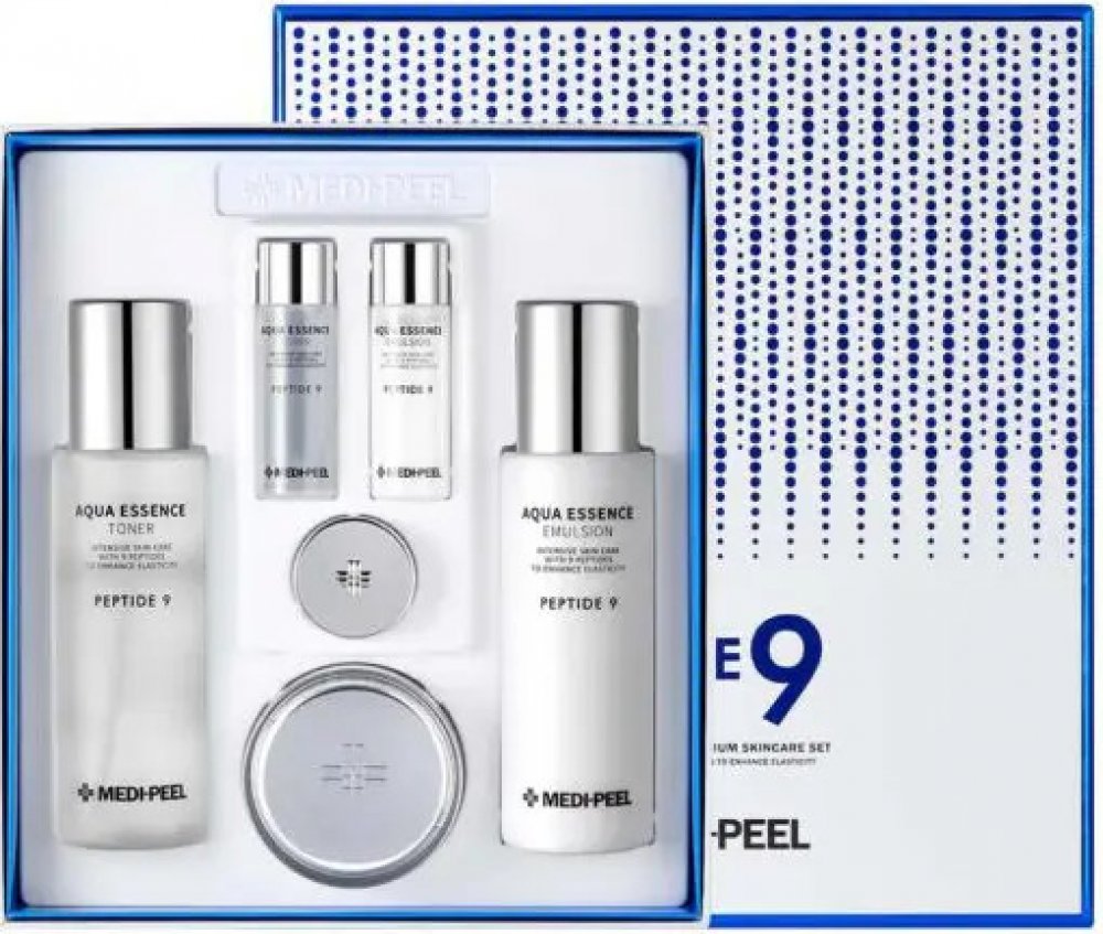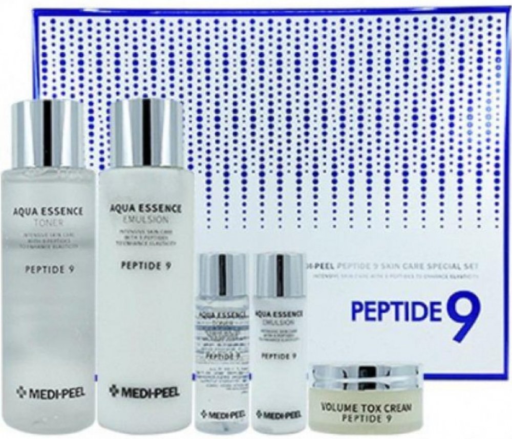 Medi-Peel Peptide 9 Aqua Essence Emulsion: Water, Methylpropanediol, Glycerin, Cyclopentasiloxane, Cetearyl Olivate, Cyclohexasiloxane, Betaine, Cetyl Ethylhexanoate, Sorbitan Olivate, Canola Oil, Caprylic/Capric Triglyceride, Glyceryl Stearate, Peg-100 Stearate, Vitis Vinifera (Grape) Seed Oil, Prunus Armeniaca (Apricot) Kernel Oil, Hydroxyacetophenone, Trehalose, Macadamia Integrifolia Seed Oil, Arginine, Carbomer, Fragrance, Hydroxyethylcellulose, Ethylhexylglycerin, Adenosine, Disodium Edta, Allantoin, Desamido Collagen, Juniperus Communis Fruit Extract, Magnolia Officinalis Bark Extract, Eucalyptus Globulus Leaf Extract, Fructan, Hydrolyzed Collagen Butylene Glycol, Hydrogenated Polyisobutene, Argania Spinosa Kernel Oil, Propanediol, Glyceryl Polymethacrylate, Sodium Hyaluronate Crosspolymer, Sorbitan Laurate, Propylene Glycol, Hydrolyzed Glycosamonoglycans, 1,2-Hexanediol, Nonoxynol-12, Sodium Hyaluronate, Phenoxyethanol, Chondrus Crispus Extract, Benzyl Glycol, Acetyl Dipeptide-1 Cetyl Ester (0.8 Ppm), Astaxanthin, Ethyl Hexanediol, Hydrolyzed Elastin, Hydrolyzed Hyaluronic Acid, Palmitoyl Tripeptide-5 (0.1 Ppm), Caprylyl Glycol, Anemarrhena Asphodeloides Root Extract, Acetyl Hexapeptide-8 (0.01 Ppm), Copper Tripeptide-1 (0.01 Ppm), Hyaluronic Acid, Acetyl Octapeptide-3 (0.005 Ppm), Palmitoyl Tetrapeptide-7 (0.005 Ppm), Hexapeptide-9 (0.005 Ppm), Raspberry Ketone, Palmitoyl Oligopeptide (0.001 Ppm), Palmitoyl Tripeptide-1 (0.001 Ppm), Palmitoyl Pentapeptide-4 (0.001 Ppm).