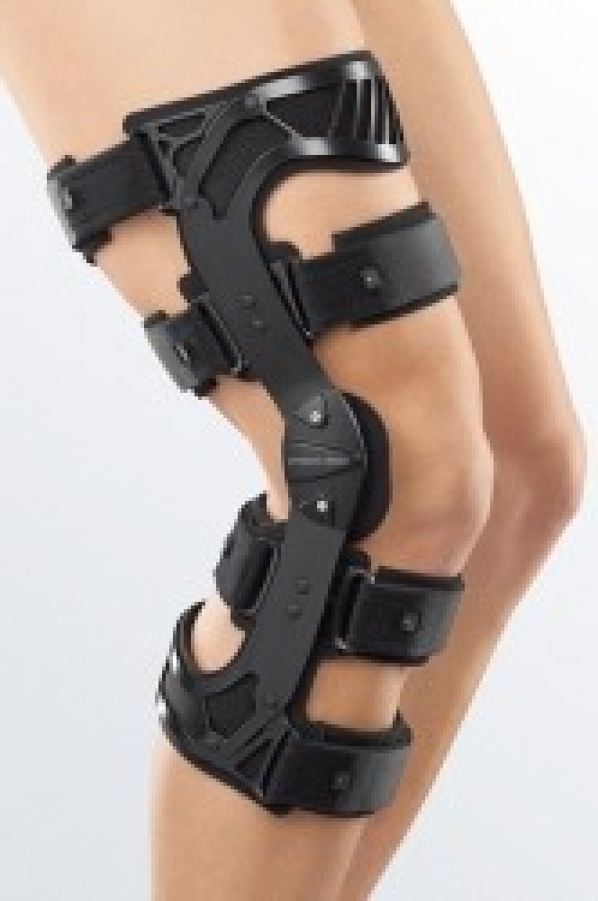 4 - bodová funkční rigidní kolenní ortéza s možností limitace pohybu. Velmi lehká vzdušná ortéza stabilizující koleno ve směru předozadním i bočním, omezuje rotační mechanizmy, multicentrický typ ohybu, možnost nastavení omezení pohybu: limitace flexe: 0°, 10°, 20°, 30°, 45°, 60°, 75°, 90° limitace extenze: 0°, 10°, 15°, 30°, 45° imobilizace: 0°, 10°, 20°, 30°, 45° Polycentrické klouby, anatomicky formované dlahy, nízký profil ortézy vhodný i pod oblečení, číslované popruhy ulehčující zapínání, soft-grip polstrování ortézy. Materiál: letecký dural Tabulka velikostí a měření velikost obvod stehna 15 cm nad kolenem [cm] XS 31-37 S 37-45 M 45-51 L 51-57 XL 57-65 XXL 65-74 Indikace: pooperační stavy (operace vazů včetně zkřížených vazů), ruptury postranních i zkřížených vazů, chronické nestability, prevence hyperextenze