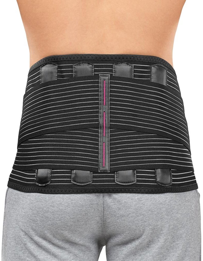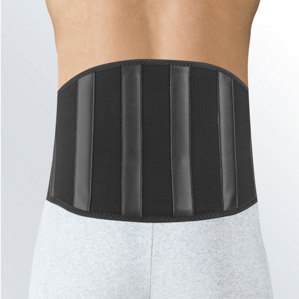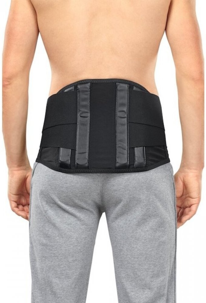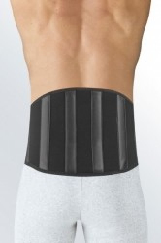 Bederní ortéza s přídavnými utahovacími popruhy. Bederní pás z kompresivního materiálu se 4 integrovanými stabilizačními výztuhami. Pomocí utahovacích cirkulárních pásků, které způsobují kompresi v břišní oblasti a podporují svalstvo trupu, docílíme odlehčení bederní páteře a následné zmírnění bolesti. Výška pásu vzadu je 26 cm, vpředu 16 cm. Tabulka velikostí velikost obvod v pase [cm] 1 60-85 2 85-105 3 105-120 4 120-145 Indikace: chronické bolestivé stavy v lumbosakrální oblasti, lumboischialgie, bolesti při spondylolýze a spondylolistéze, doléčení po operacích a úrazech bederní páteře, kde není potřeba zcela rigidní fixace.