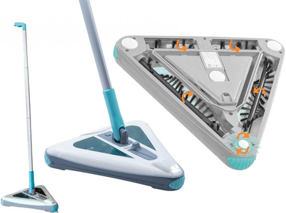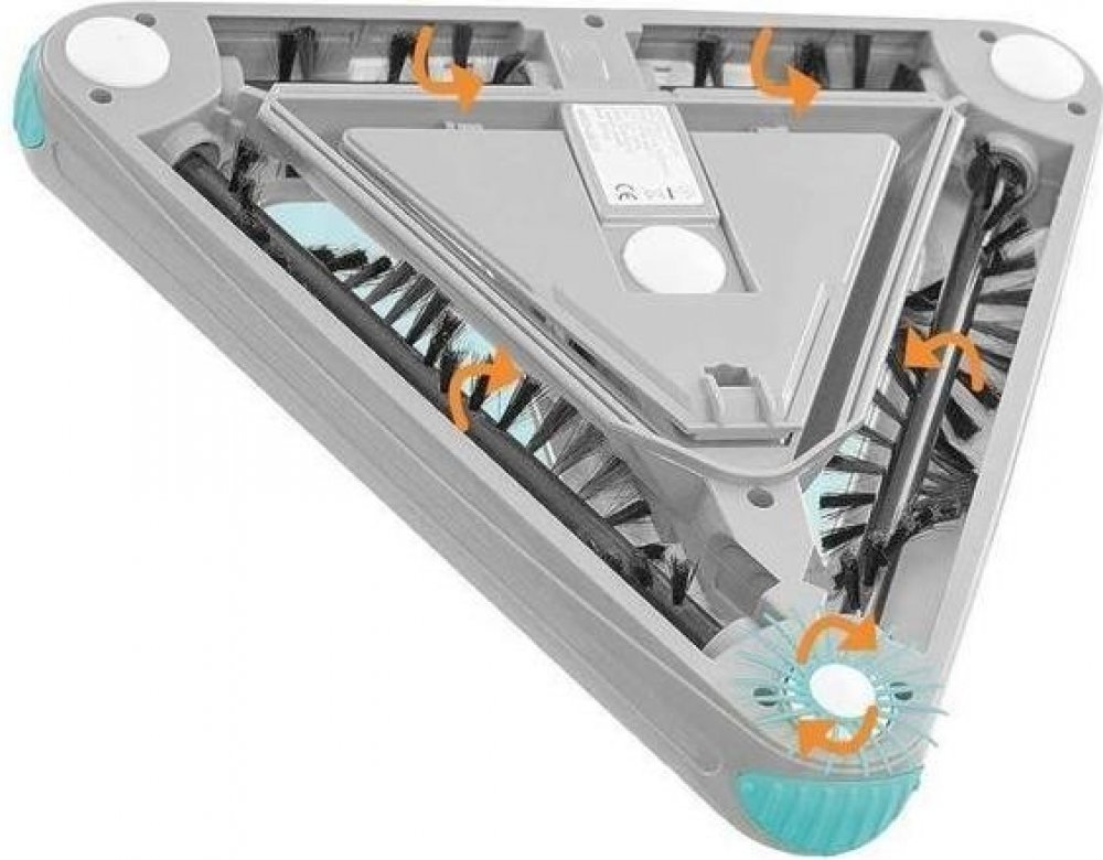 Důmyslný akumulátorový čistič podlah s 360° otočnými kartáči a trojúhelníkovým designem.