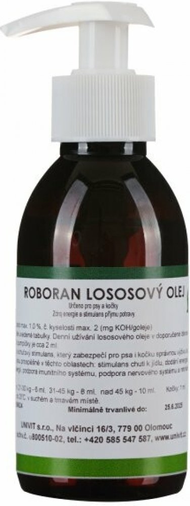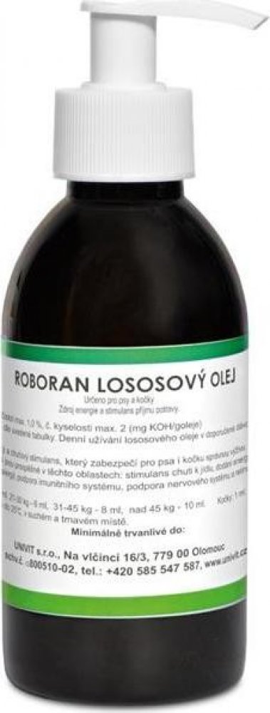Roboran lososový olej je čistý přírodní produkt s vysokým obsahem omega-3 nenasycených mastných kyselin, které jsou pro zdraví zvířete nepostradatelné, avšak organismus si je nedokáže sám vytvořit. Tyto esenciální mastné kyseliny pocházejí výhradně z ryb...