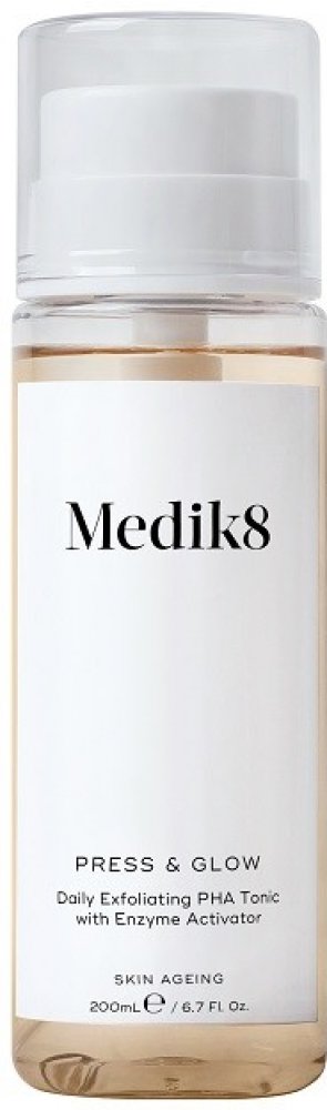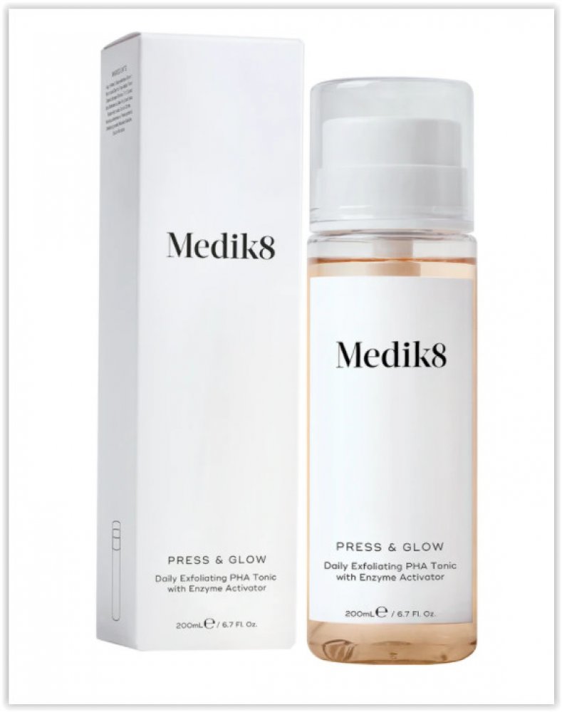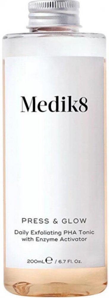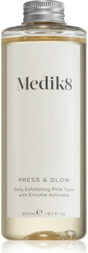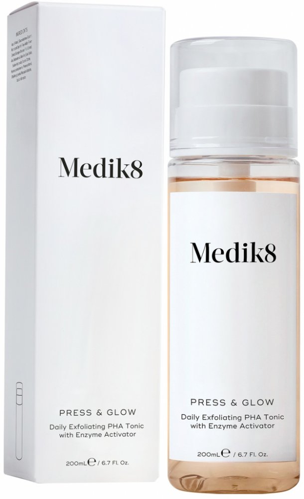 Exfoliační tonikum Medik8 Press & Glow je vhodné pro citlivější pleť, která nesnáší klasická exfoliační tonika s obsahem AHA/BHA kyselin. Podporuje přirozenou exfoliaci pleti a účinek vitamínu A (retinolu).