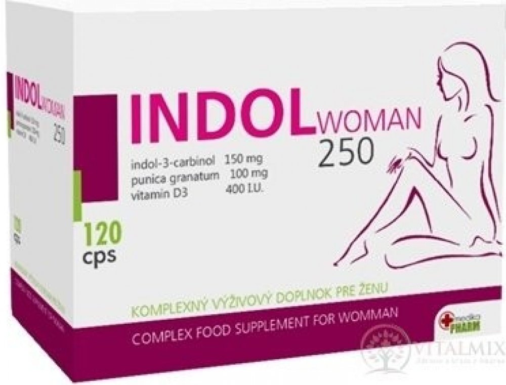 INDOL WOMAN 250 120 cps Doplněk stravy napomáhající ke správné funkci ženských pohlavních orgánů. Obsahuje Indol-3-carbinol, granátové jablko a Vitamín D3.