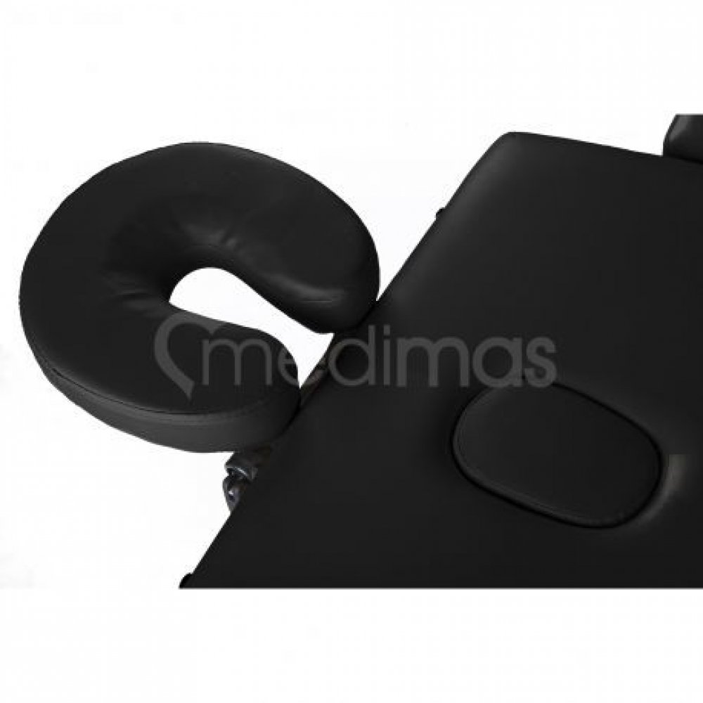Součástí masážního stolu jsou i nezbytné doplňky - podhlavník, jenž má odolnou kovovou konstrukcí (vodící trubky ve stole), a loketní opěrka pod hlavovým dílcem.