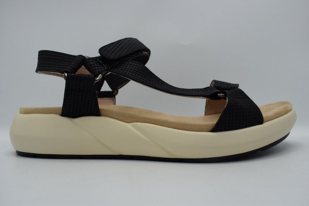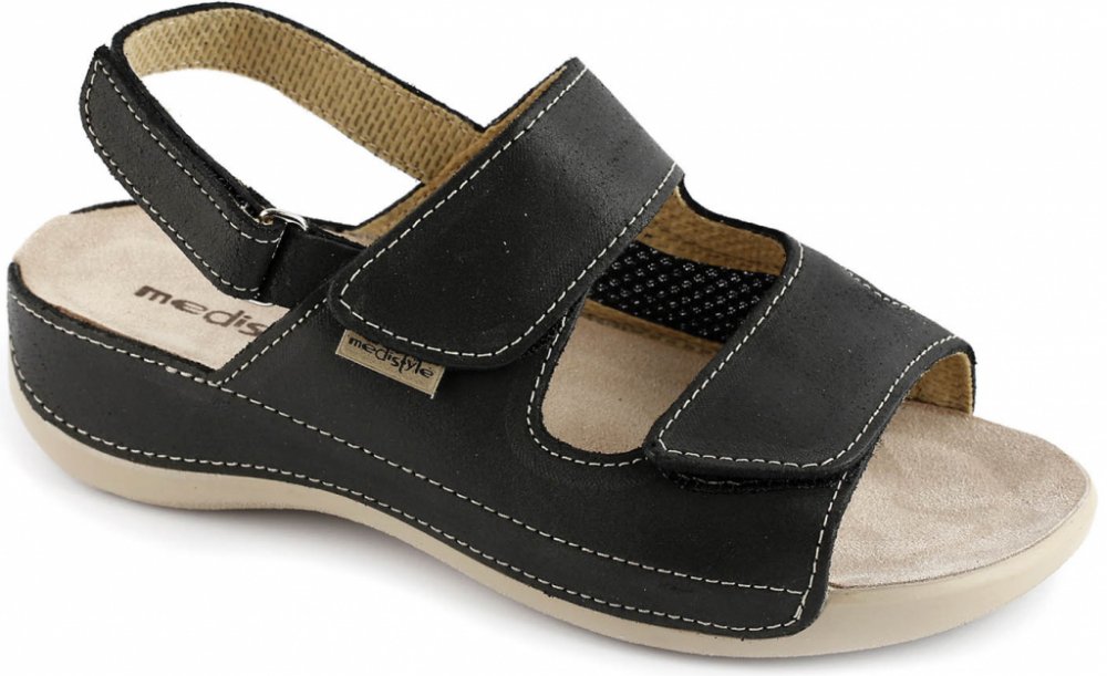Dámský sandál pro široká chodidla se síťovinou na vybočený kloub palce (halux). Obuv je vhodná na ven, jako pracovní obuv nebo na doma. Regulace šířky třemi suchými zipy. Svršek je vyroben z hladké kůže, stélka je kožená, anatomicky tvarovaná (po navlhnutí nutno nechat přirozeně vyschnout).