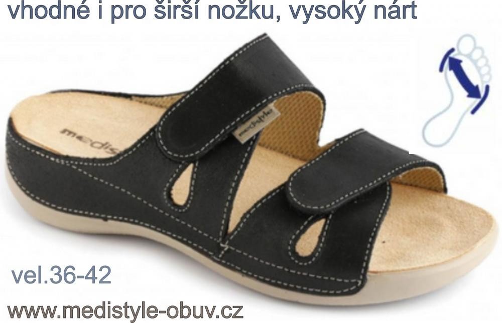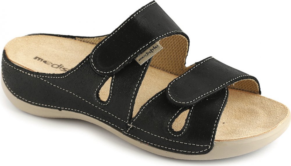 Pohodlné pantofle Medistyle jsou v černé barvě. Svršek obuvi je ze dvou lícových hovězinových kožených pásků. Pásky jsou na suchý zip. Obuv se dá nastavit dle šíře nohy – je vhodná i pro vysoký nárt. Stélka je anatomicky tvarovaná, taktéž kožená. Po navlhnutí je nutné nechat stélku přirozeně vyschnout. Podešev absorbuje nárazy vznikající při došlapu a chrání tak Vaše klouby a záda. Podešev je prot...