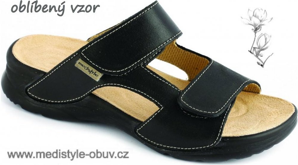 Pohodlné, komfortní pantofle Medistyle, mají přes nárt dva pásky na suchý zip pro regulaci šíře. Svrchní materiál je hovězinová useň. Stélka je usňová, anatomicky tvarovaná, respektuje tvar nohy, poskytuje ideální hloubku podpatkového obloučku a tlumí nárazy. Po navlhnutí je nutné nechat stélku přirozeně vyschnout.