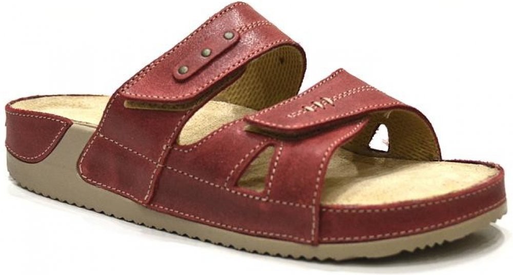 Pohodlné pantofle Medistyle jsou v červené barvě. Svršek obuvi je ze dvou lícových hovězinových kožených pásků. Pásky jsou na suchý zip. Obuv se dá nastavit dle šíře nohy. Stélka je anatomicky tvarovaná, taktéž kožená. Po navlhnutí je nutné nechat stélku přirozeně vyschnout. Podešev je vyšší, měkká a ohebná, velice příjemná na celodenní nošení. Obuv je vhodná jako přezůvky do práce i na doma.