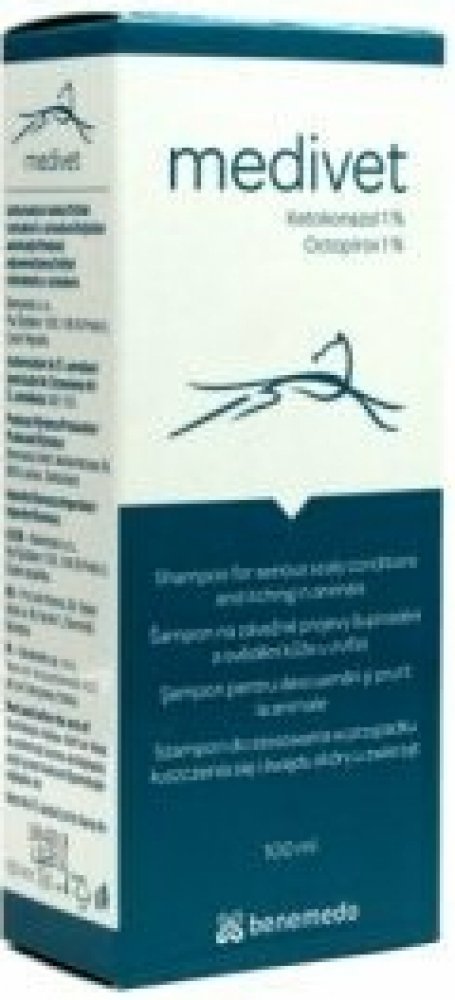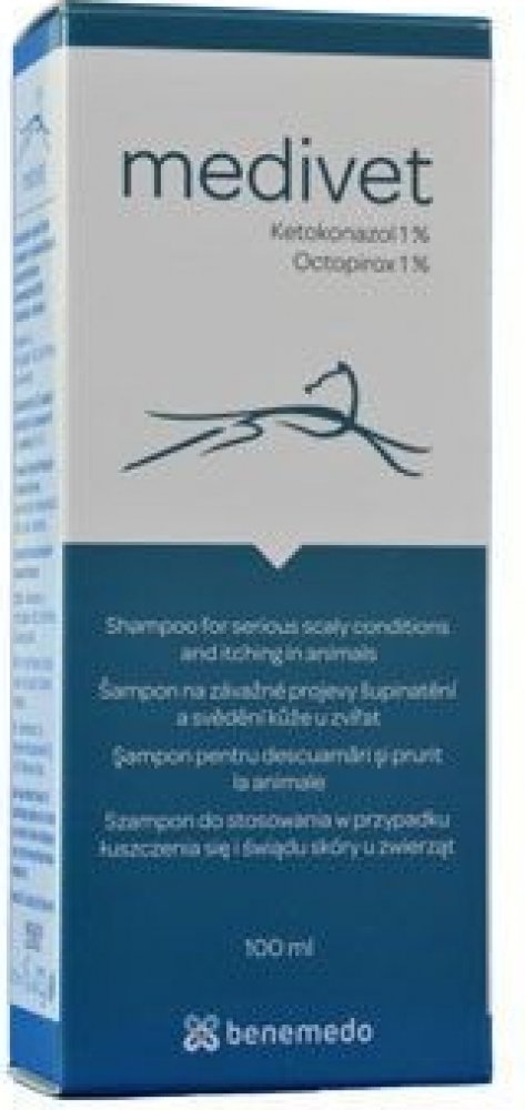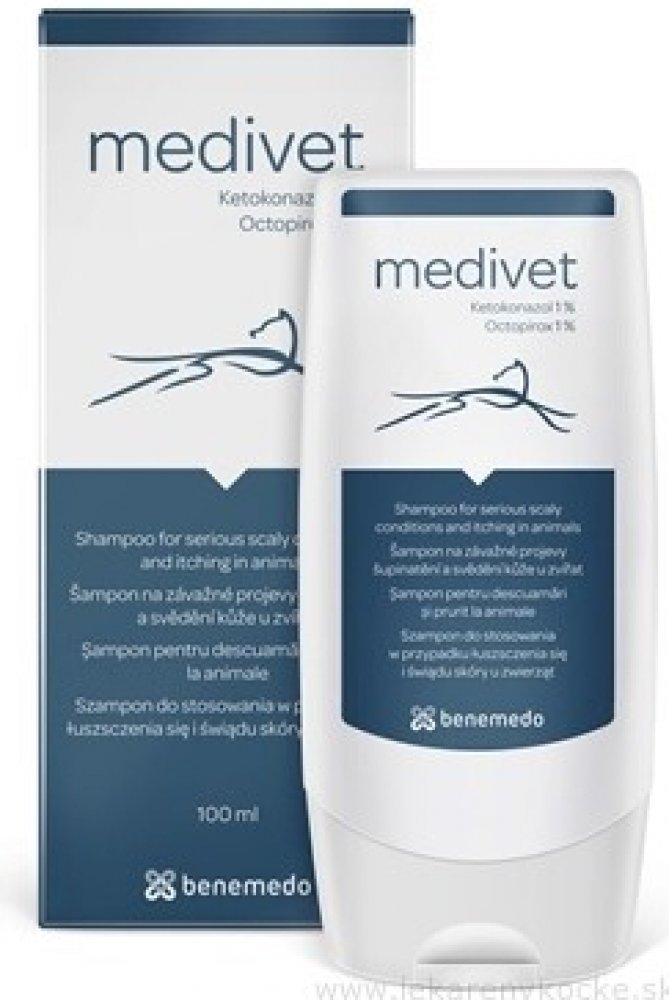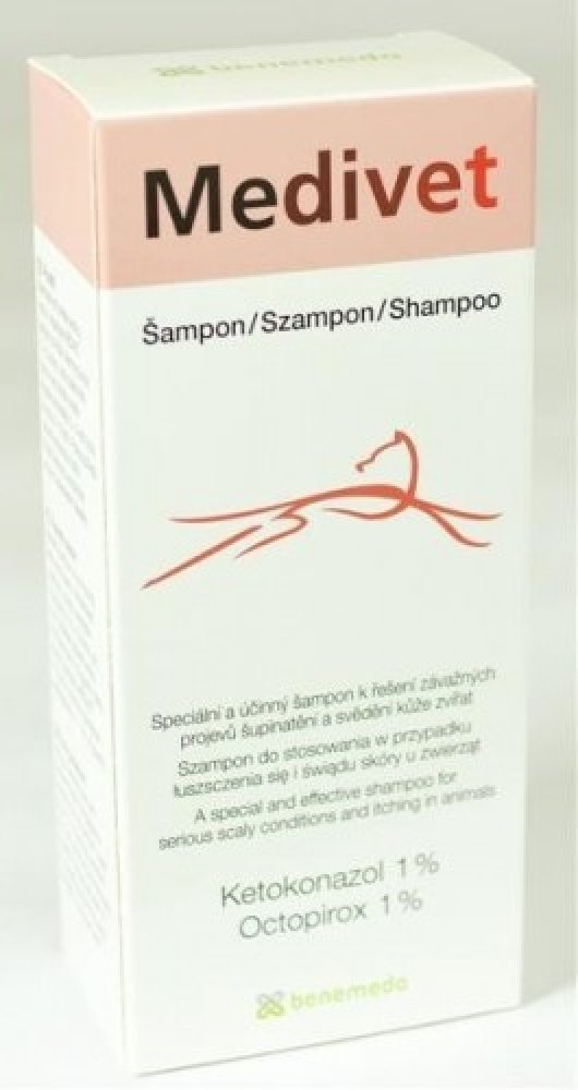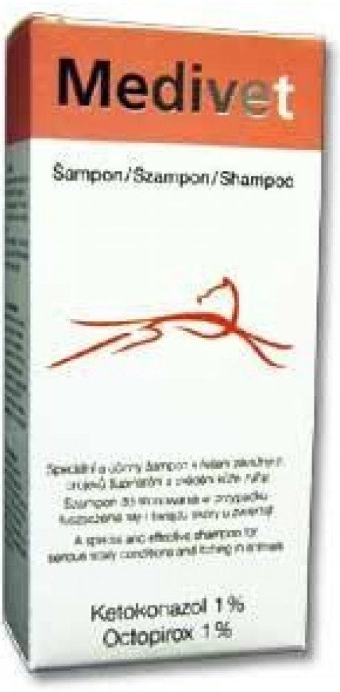 Účinný speciální šampon k léčení závažných projevů šupinatění a svědivosti kůže zvířat, zbavuje suchou kůži lupů. 100ml Medivet je účinný v péči o problémovou kůži a srst psů, koček, koní a dalších zvířat. Přípravek obsahuje účinné látky ketokonazol a octopirox, které působí na přemnoženou kožní mikroflóru. Ketokonazol působí proti přemnožování kvasinek. Octopirox účinkuje jak na kvasinky, tak na bakterie. Díky kombinaci obou látek je šampon účinný v podpůrné terapii plísňových, kvasinkových a sekundárních bakteriálních infekcí kůže s projevy šupinatění a svědění, např. u atopických zvířat. Po použití šamponu je srst lesklá a zdravá. Složení: Ketokonazol, Octopirox. Navlhčete srst zvířete vlažnou vodou. Vmasírujte šampon do kůže. Nechte působit 10 - 15 minut, poté opláchněte vodou a srst dobře osušte. Koupání provádějte 2 - 3 krát týdně po dobu 4 - 6 týdnů.