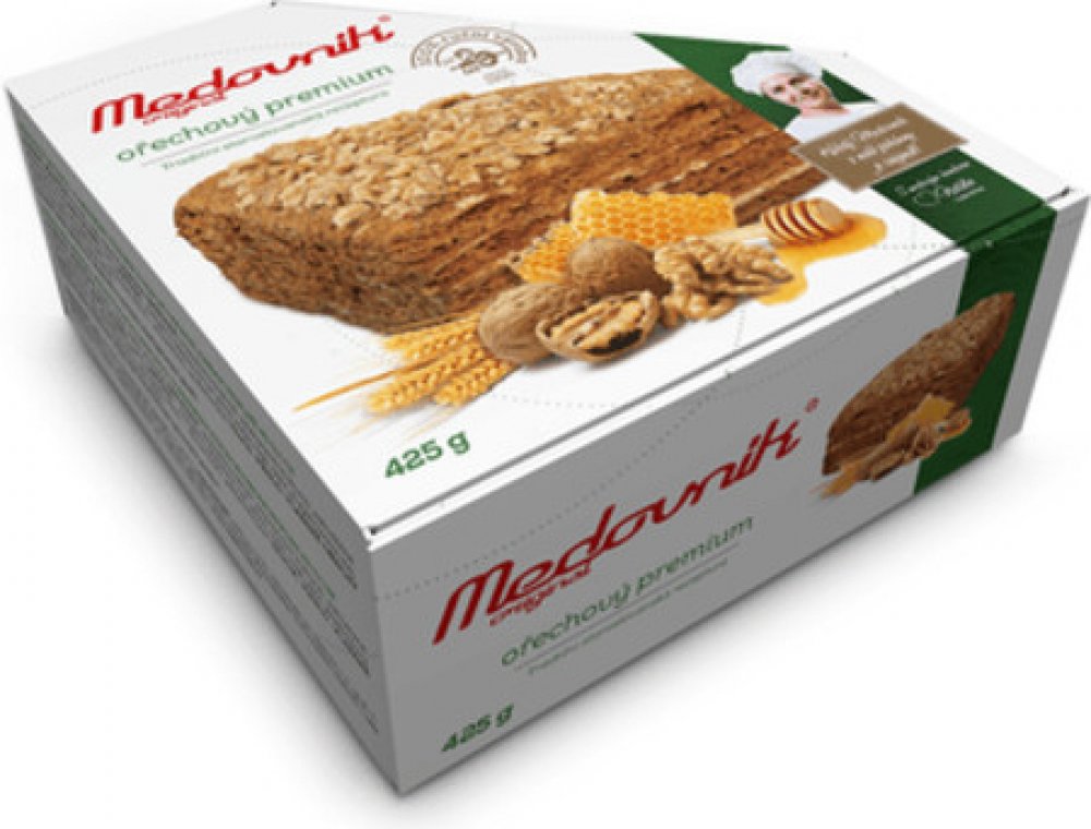 Na jaře v roce 2018 jsme na trh uvedli novou řadu výrobků „Medovník originál PREMIUM“, charakteristickou velkým množstvím použitých vlašských ořechů, kterými je dort doslova obsypán.