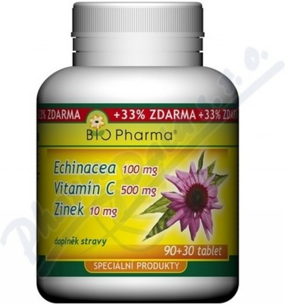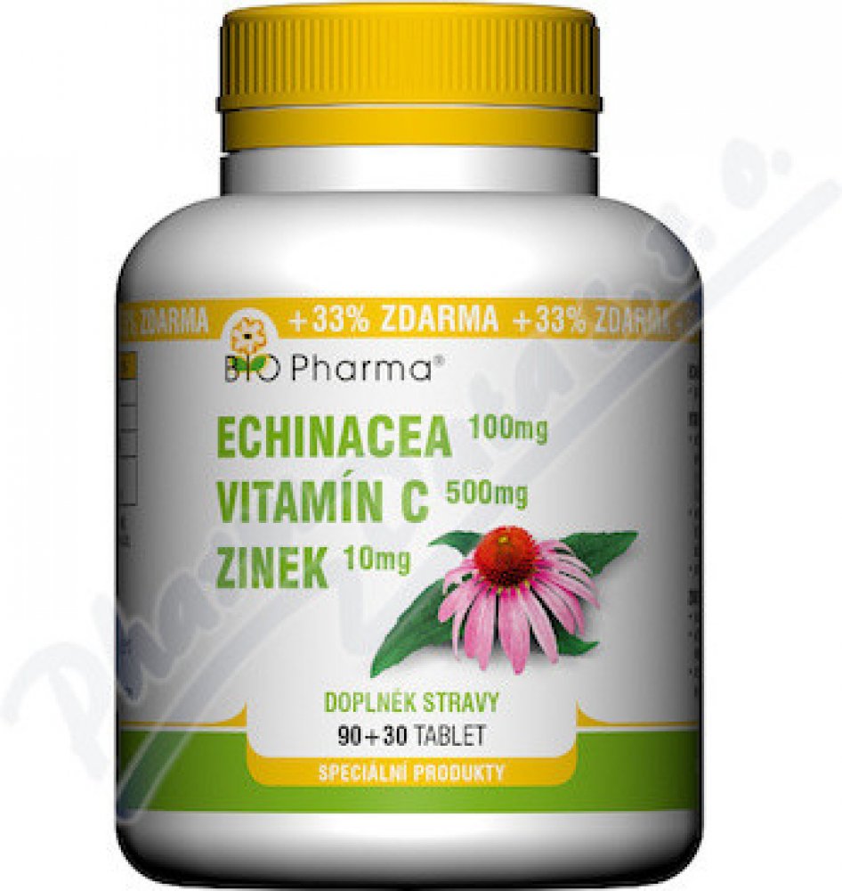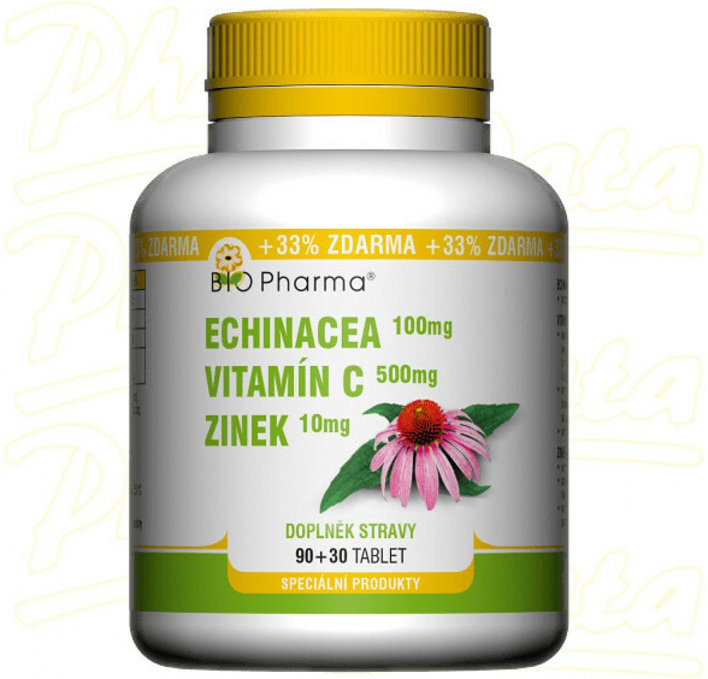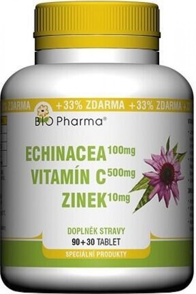 Doplněk stravy BIO-Pharma Echinacea plus vitamín C plus zinek je ve formě polykacích tablet. Výrobek obsahuje minerál zinek, vitamín C a extrakt z Echinacea purpurea. Přípravek přispívá ke správnému fungování imunity.Vitamín C a zinek přispívají k normální funkci imunitního systému.Echinacea purpurea napomáhá správné funkci imunitního systému a přispívá k normální funkci dýchacího systému.Balení o...
