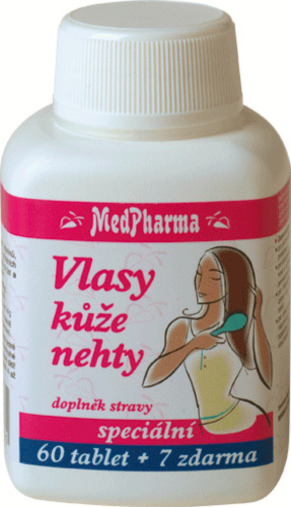 Speciální přípravek Vlasy, kůže, nehty obsahuje vitaminy, minerály, stopové prvky a přírodní výtažky. Zinek s biotinem přispívají k udržení normálního stavu vlasů a pokožky, selen přispívá k udržení normálního stavu nehtů.