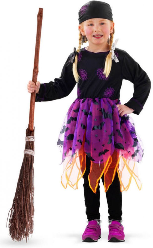 - Kostým čarodějnice obsahuje tričko se sukní a šátek na hlavu.