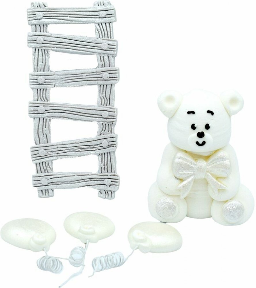 Cukrová dekorace s motivem medvídka, žebříku a balónků pro rychlé a čisté dozdobení dortu. Hotový motiv snadno umístíte na povrch dortu a okamžitě získáte výrazný prvek bez složitého modelování.
