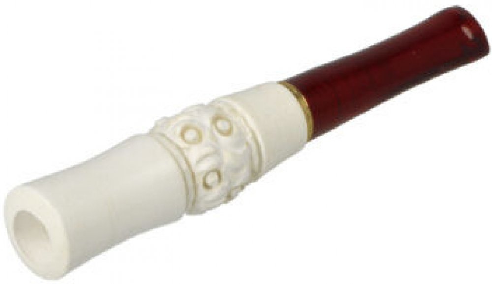 Krátká cigaretová špička Meerschaum bez filtru. Špičky na cigaretu Meerschaum od předního tureckého výrobce produkující nejen cigaretové špičky, ale především kvalitní dýmky z mořské pěny (dýmky Meerschaum). Ručně vyrobená špička z tureckého Meerschaumu je vybavená barevným lesklým náustkem z akrylátu. Hladký lesklý povrch v přírodním odstínu je bohatě zdobený řezaným motivem. Meerschaum je organi...