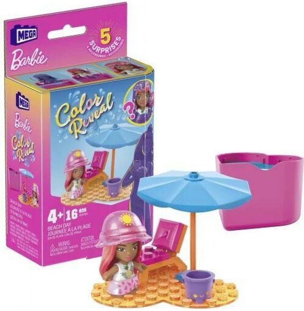 Stavebnice MEGA™ Barbie® Color Reveal™ skrývají zábavná překvapení. Vzhled každé malé panenky je záhadou, která čeká na objevení. Začněte tím, že otevřete nádobu ve tvaru srdce a najdete 2 sáčky s překvapením.