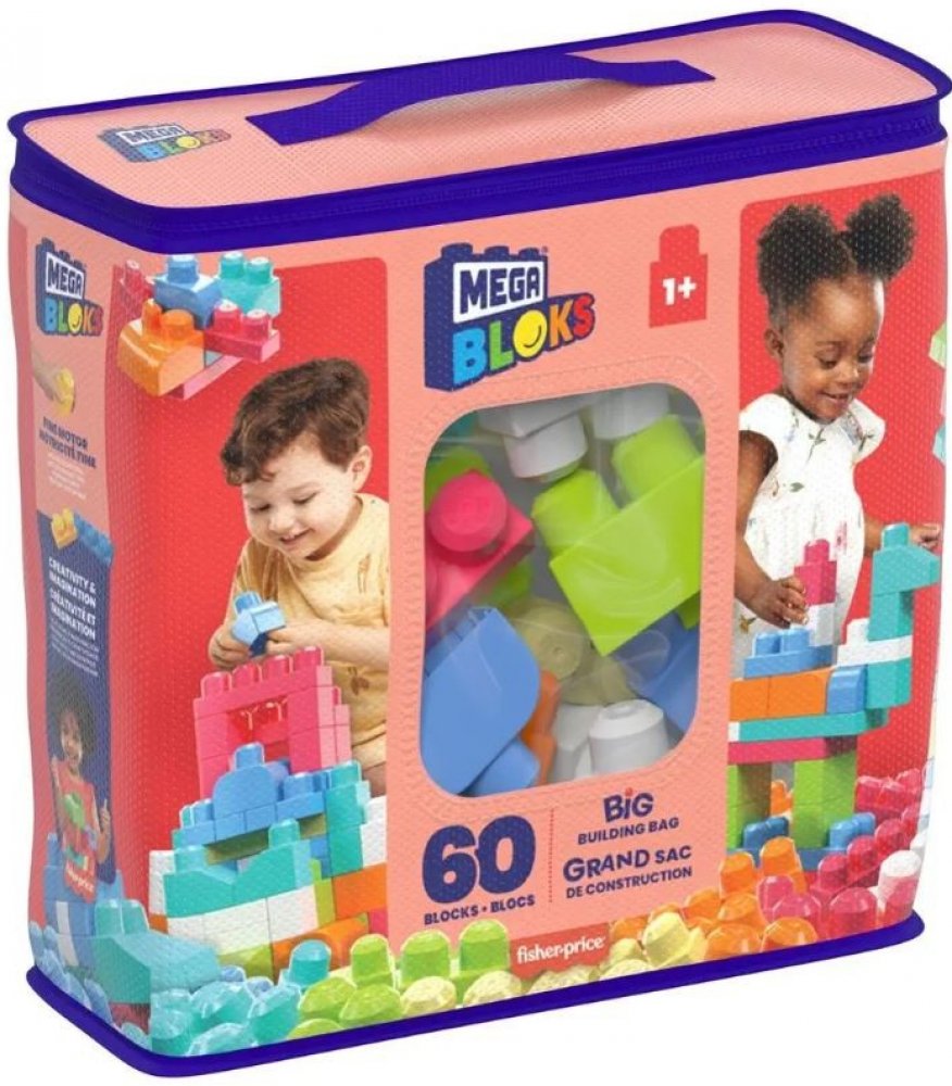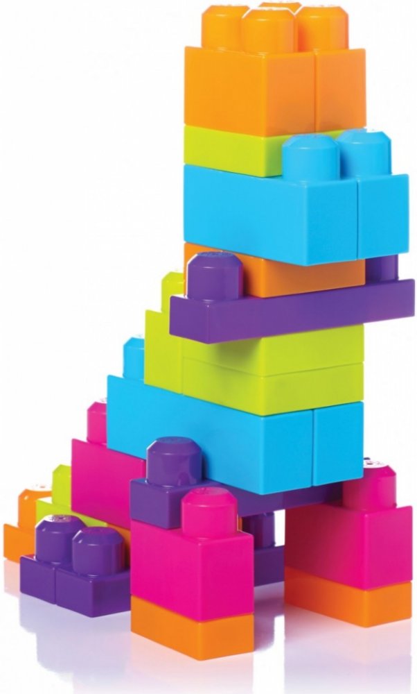 Plastové kostky v praktickém pytli v jemných pastelových barvách. Speciálně tvarované kostky Mega velikosti jsou vhodné pro všechny malé stavitelky.