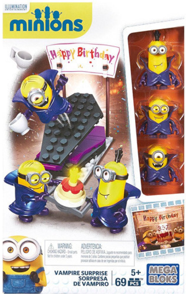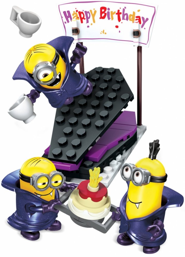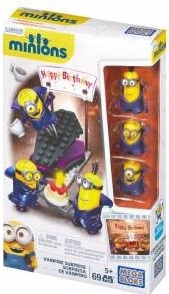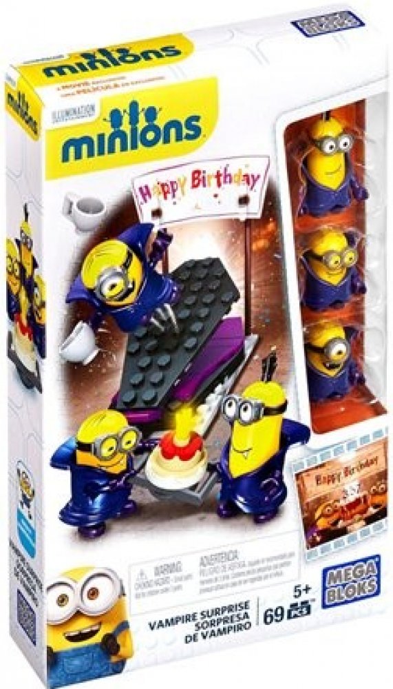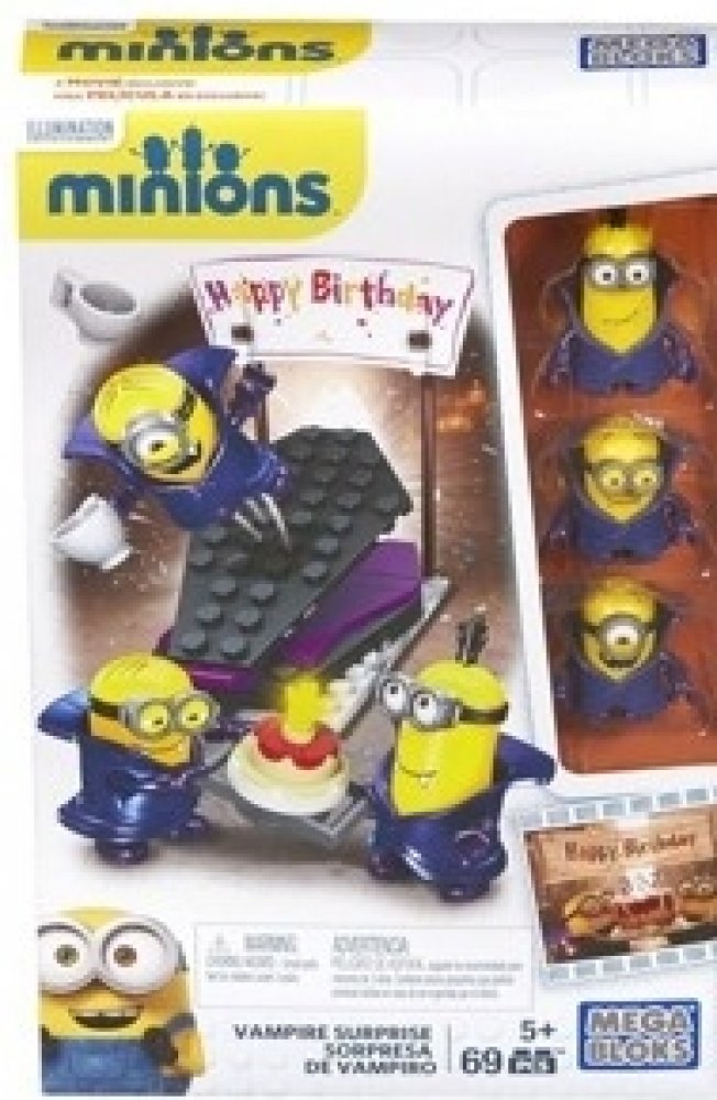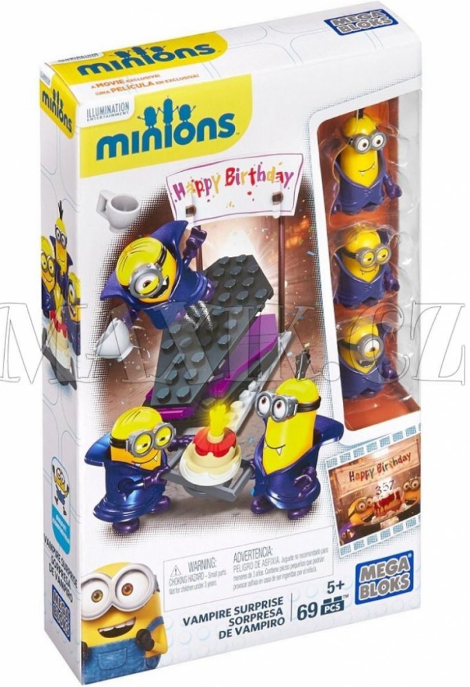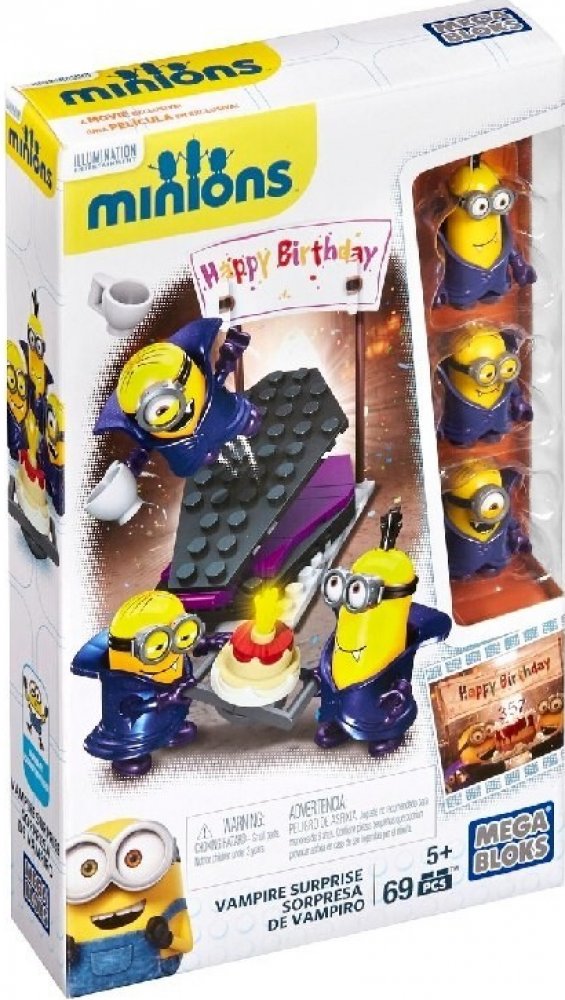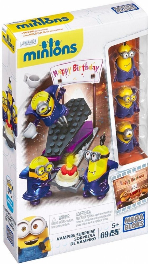 Originální zábava s trojicí Mimoňů ti vezme dech! Nové sady od Mega Bloks Mimoňové přichází hned ve dvou stylech, v pirátském a v upířím! Zatímco Mimoňové převlečeni za piráty bojují se žralokem bílým, transylvánští výtržníci chystají úžasnou oslavu se speciálním dortem a ohňostrojem! V prvním případě můžeš zachraňovat Mimoně před strašlivým žralokem pomocí prutu a banánů a v druhém příběhu katapu...