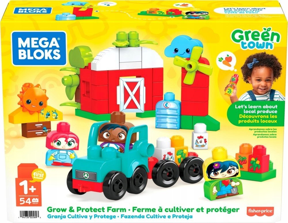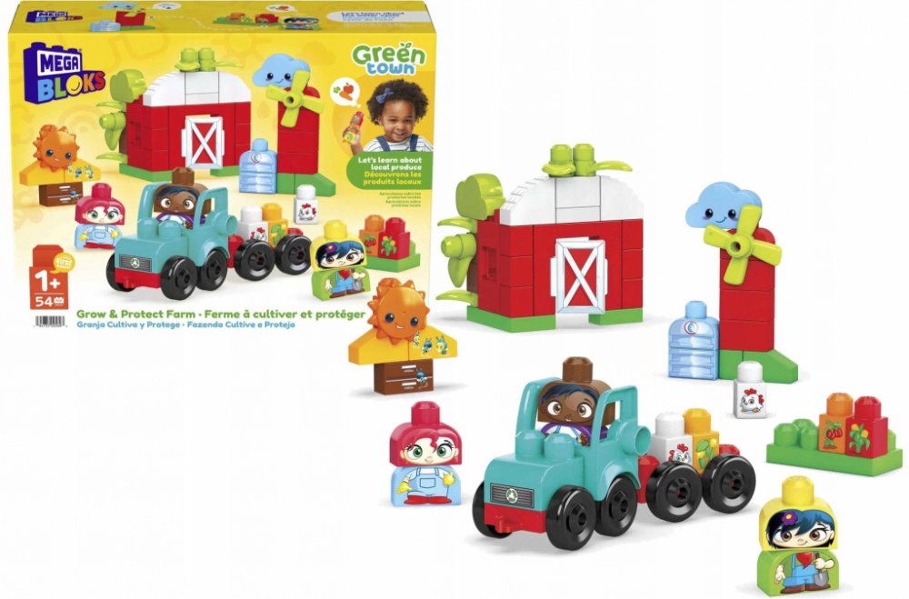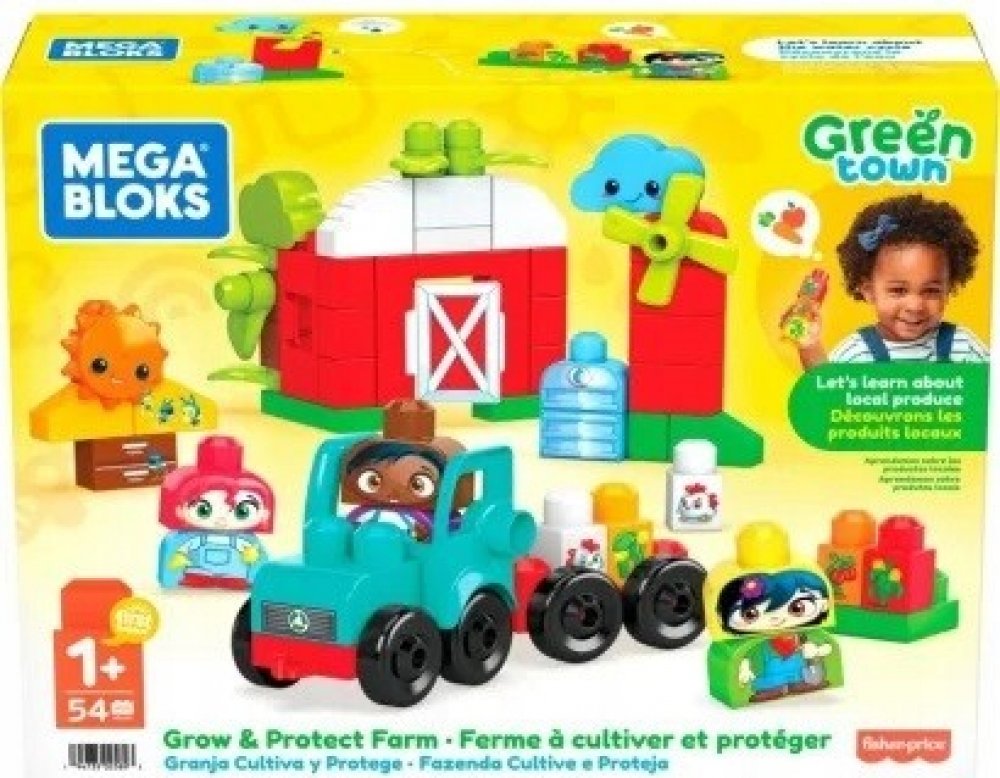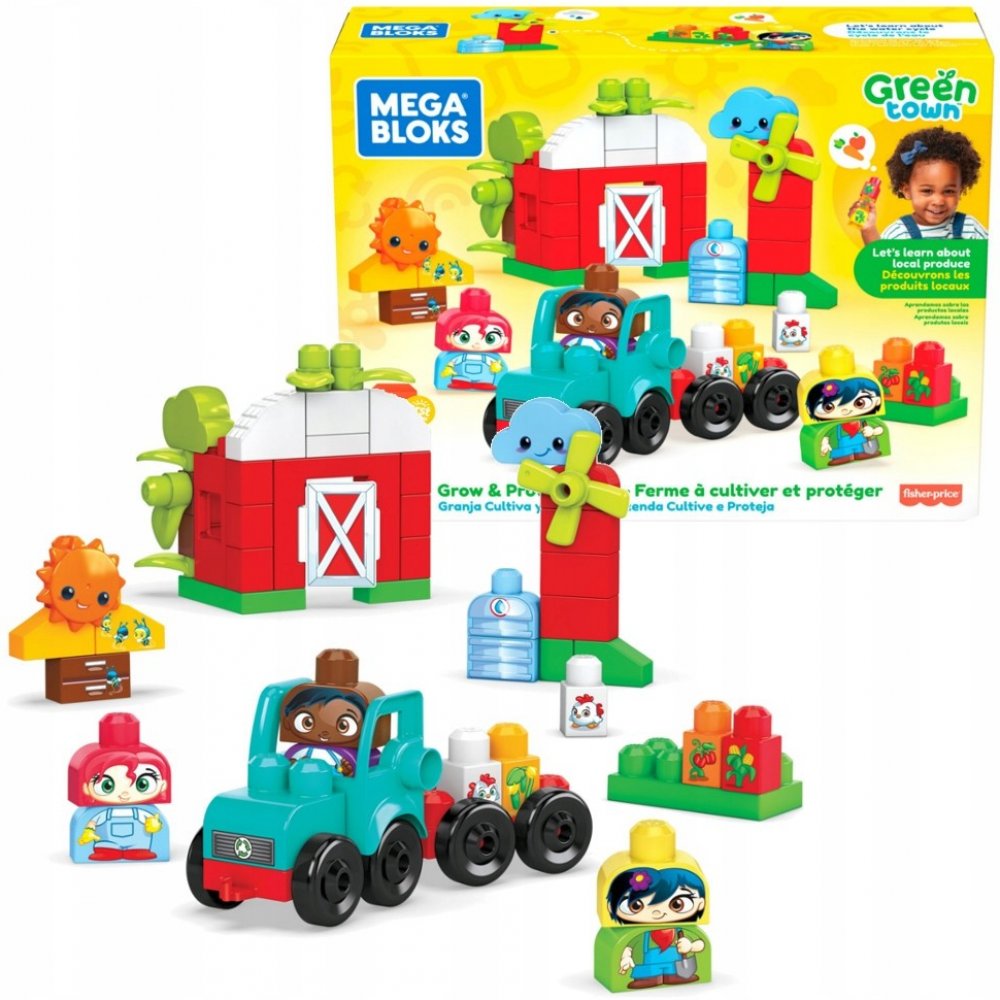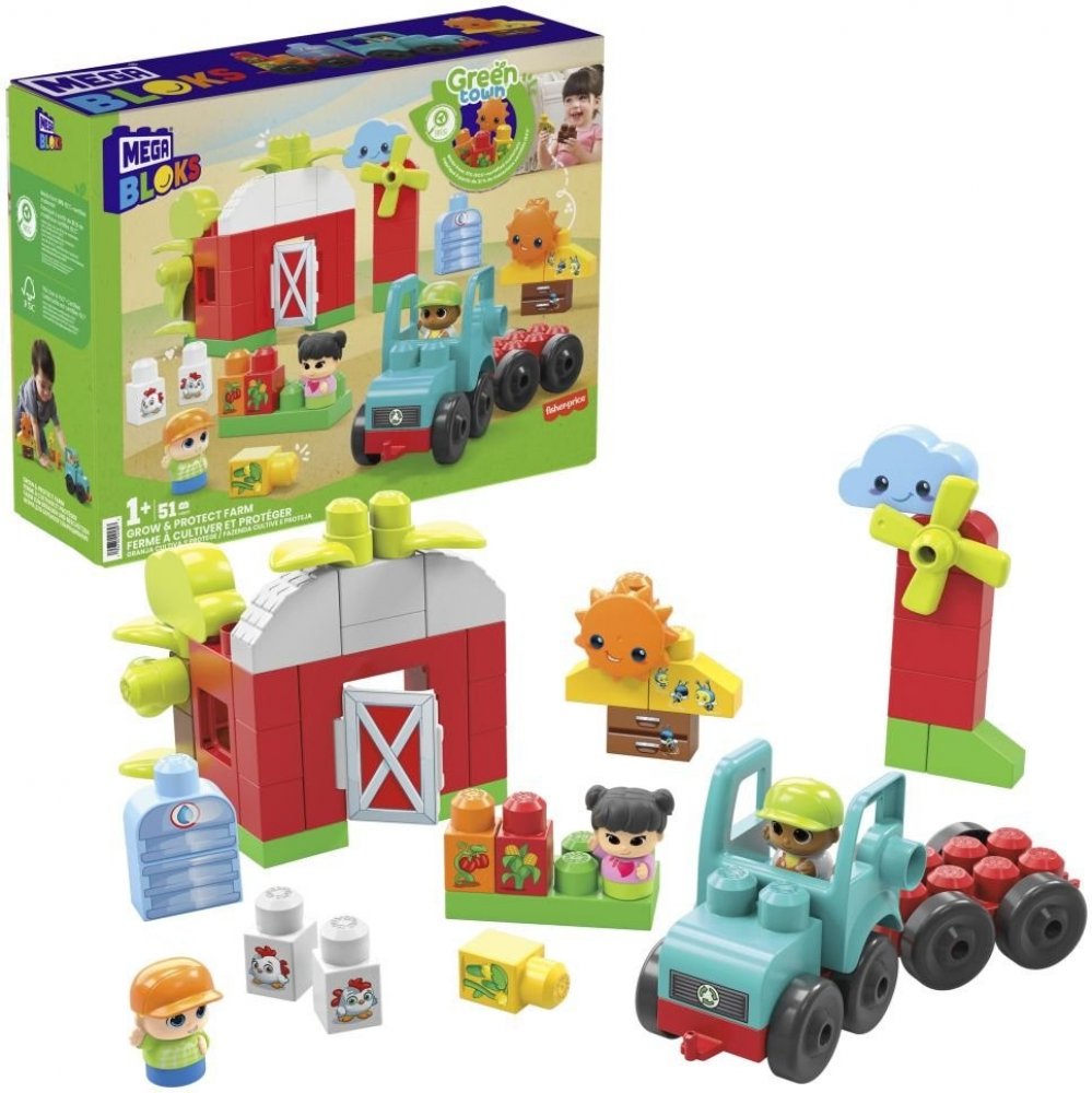 Mega Bloks Zelené město Farma vypěstuj a ochraňuj si Vaše dítě zamiluje. Tato stavebnice obsahuje 54 velkých stavebních kostek včetně speciálních dílků a stavitelného traktoru se 2 pojízdnými podvozky vyrobené z plastů z udržitelných zdrojů. Batolata si mohou postavit 3 postavičky, traktor, stodolu, plodiny, úl a otáčecí větrný mlýn.