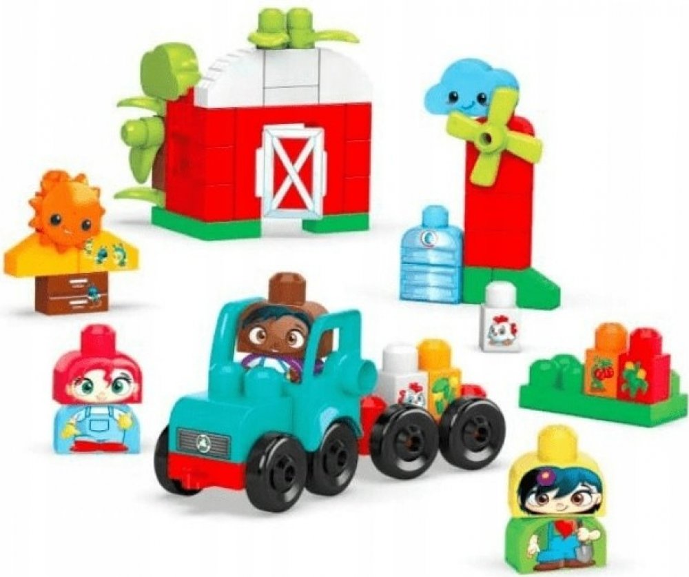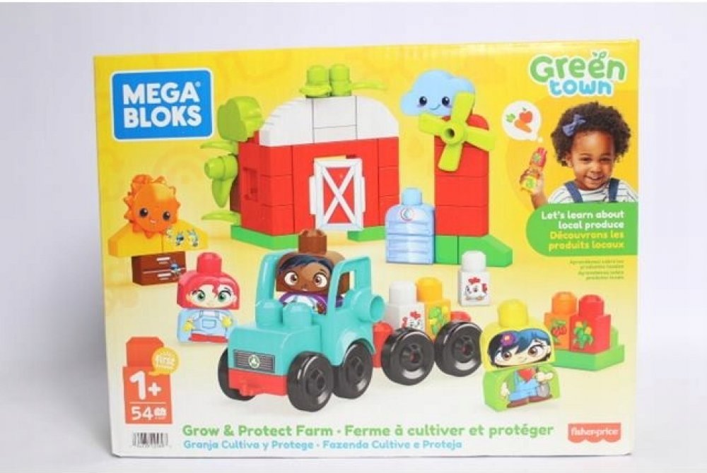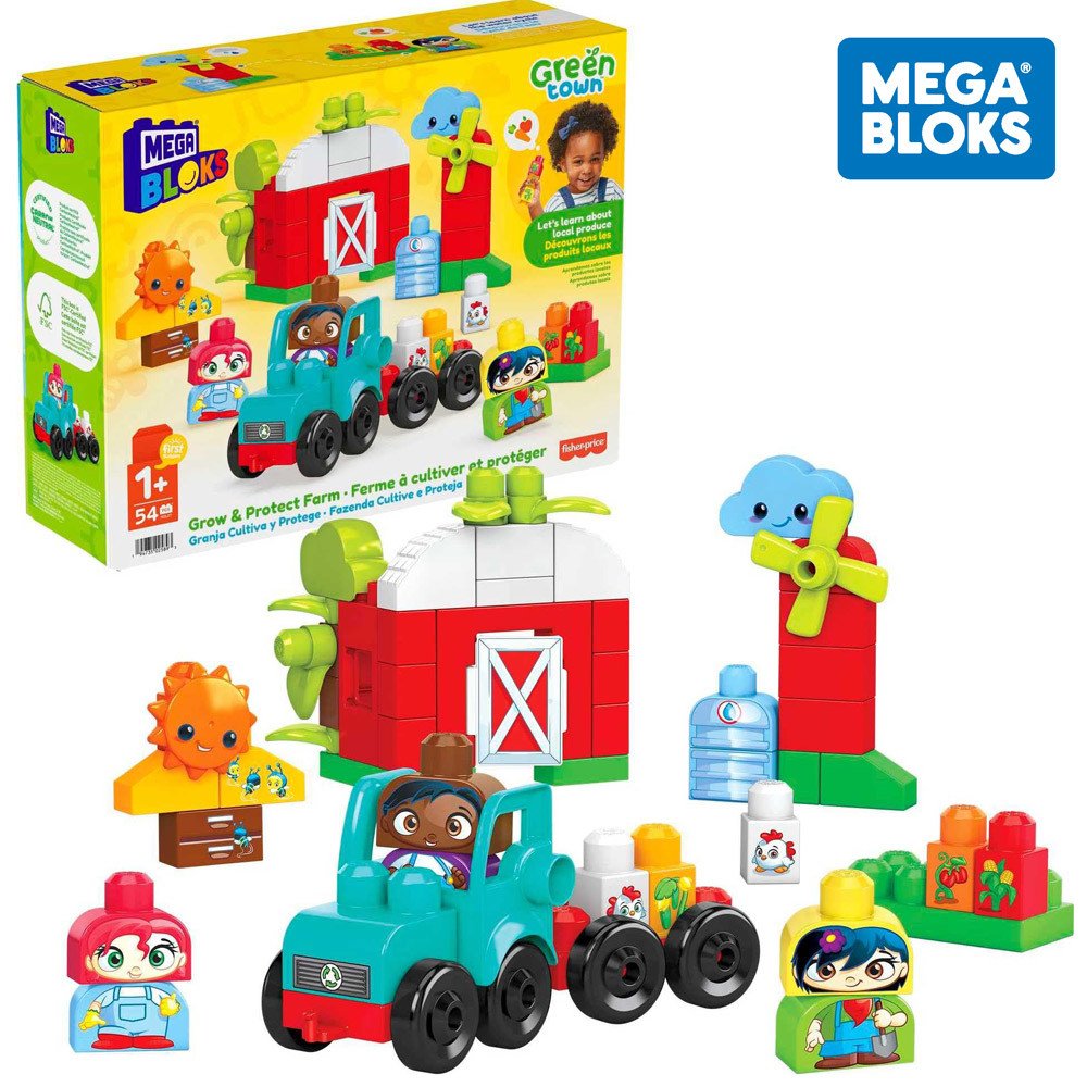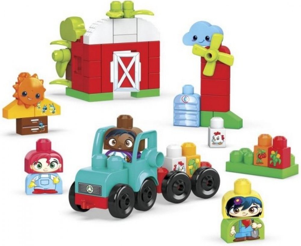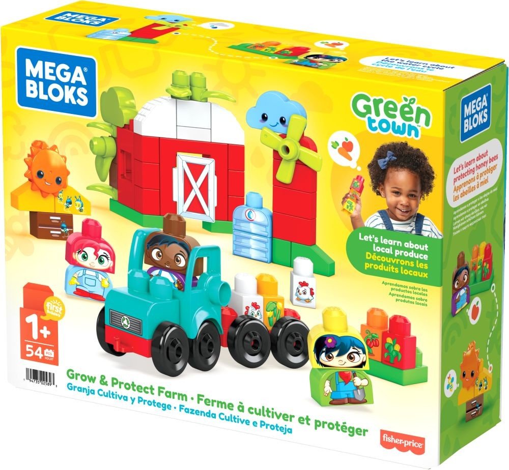 Mega Bloks Zelené město Farma vypěstuj a ochraňuj si Vaše dítě zamiluje. Tato stavebnice obsahuje 54 velkých stavebních kostek včetně speciálních dílků a stavitelného traktoru se 2 pojízdnými podvozky vyrobené z plastů z udržitelných zdrojů. Batolata si mohou postavit 3 postavičky, traktor, stodolu, plodiny, úl a otáčecí větrný mlýn.