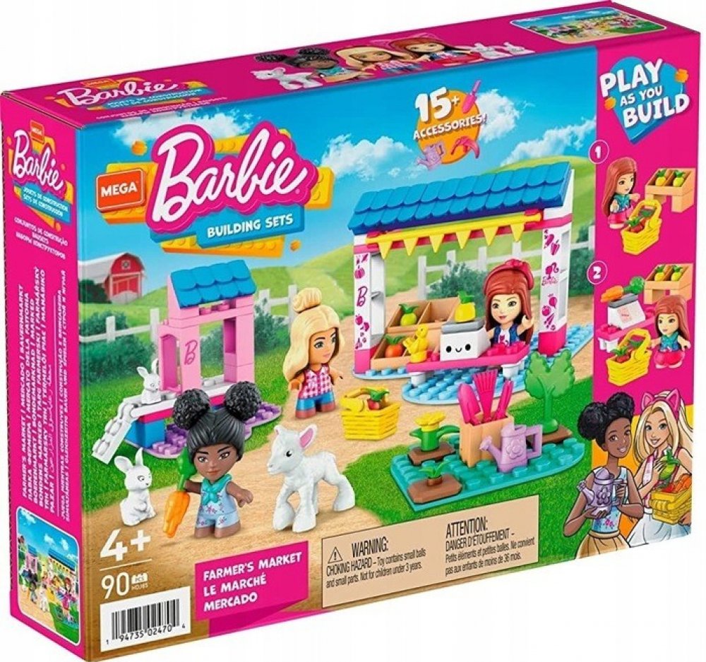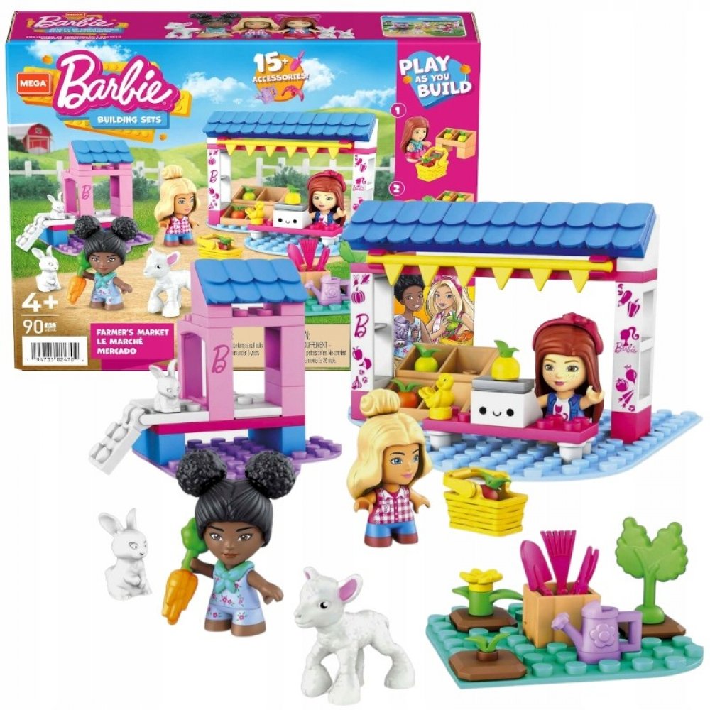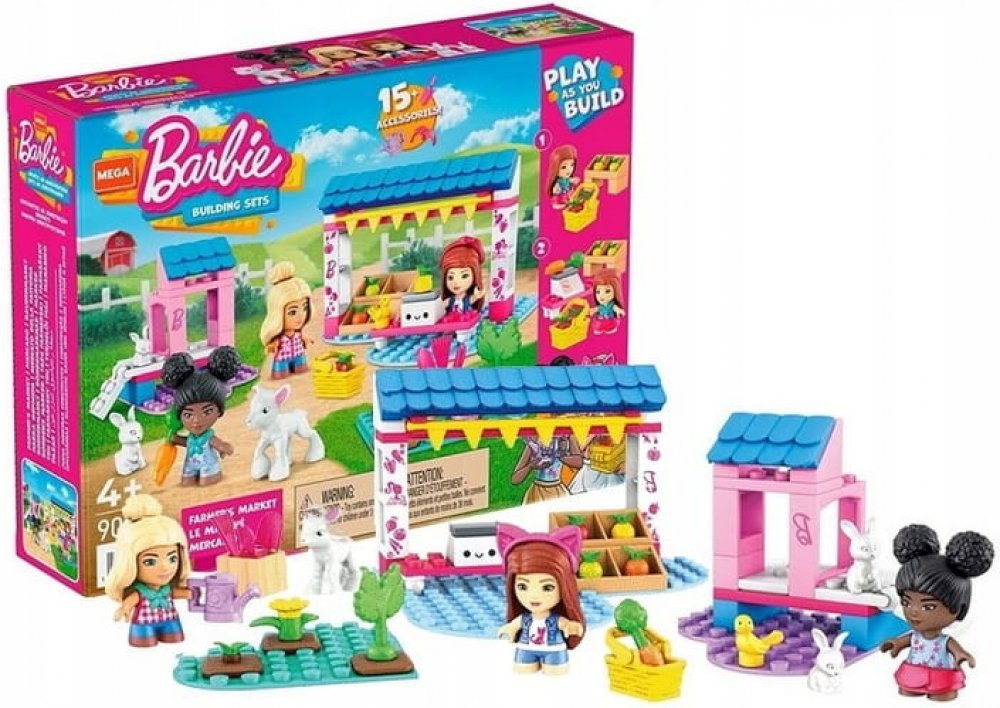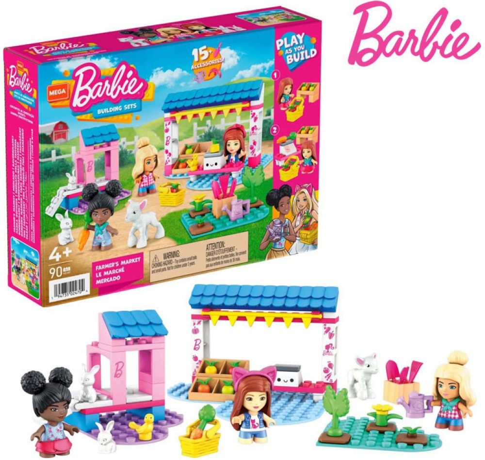 Zahraj si na dobrodružný den na trhu a pomoz 3 mikrobábikám Barbie otevřít stánek. Malí farmáři se mohou bavit budováním zahrady a sázením plodin. Pak už jen stačí postavit stánek se zeleninou a postavit se k pokladně, aby mohly začít prodávat svou úrodu. Postarej se o ptáčky, králíčky a ovečky, a navíc postav králíkárnu. Tato stavebnice se snadno sestavuje a poskytuje lahodnou zábavu v každé fázi stavby. Stavební hračky Wonder Builders byly vytvořeny s ohledem na malé stavitele od 4 let.Pomocí 6 módních doplňků můžete vylepšit styl mikro panenek. Můžete se bavit stavěním zahrádky, domečku pro králíčky a stánku se zeleninou, které dokonale doplňují doplňky, jako je zelenina, pokladna a další.Kostky jsou kompatibilní se všemi stavebnicemi MEGA Barbie a kostkami dalších předních značek. Tím, že si děti mohou stavět samy, rozvíjejí svou kreativitu a schopnost řešit problémy.Sada obsahuje: obsahuje: 3 mikro panenky Barbie, 4 zvířátka, 80 kostek se speciálními prvky a doplňky a 3 základny ve tvaru srdce, na kterých lze stavět. Můžeš si postavit stánek se zeleninou a pomáhat i za pokladnou. Také můžeš postavit domeček i pro zajíčka a postarat se o všechny milá zvířátka. Balení obsahuje 90 dílků. Popis produktu:Na farmářském trhu mohou děti pomoci 3 mikrobábikám Barbie prodávat jejich zboží. Malí farmáři si hrají podle svých představ, když zdobí zahrádku a sázejí plodiny. Pak mohou postavit stánek se zeleninou a přiložit pomocnou ruku za pokladnou. Když postaví králíkárnu, mohou se starat o ptáčka, pár králíčků a jehňátko zároveň. Tato stavebnice je určena pro začínající stavitele a snadno se sestavuje. V každém kroku stavění můžete vymýšlet a přehrávat ty nejroztomilejší příběhy. Hračky Wonder Builders ke stavění jsou určeny pro malé kutily od 4 let