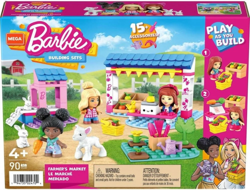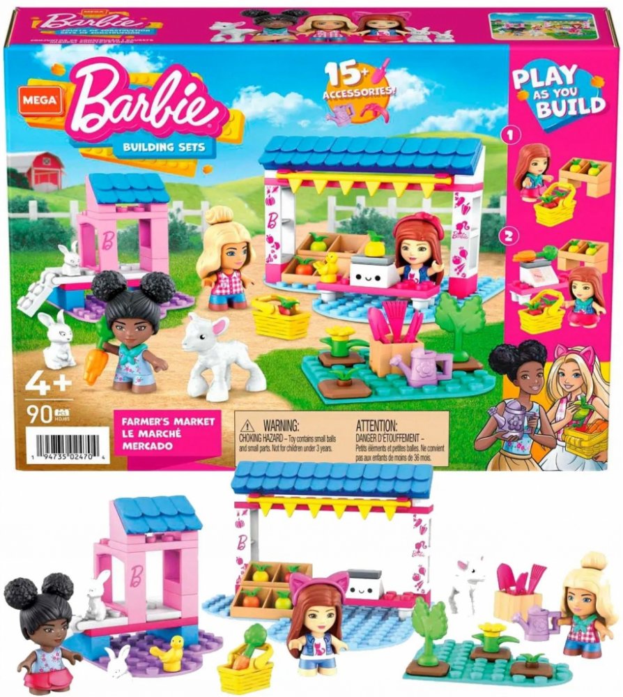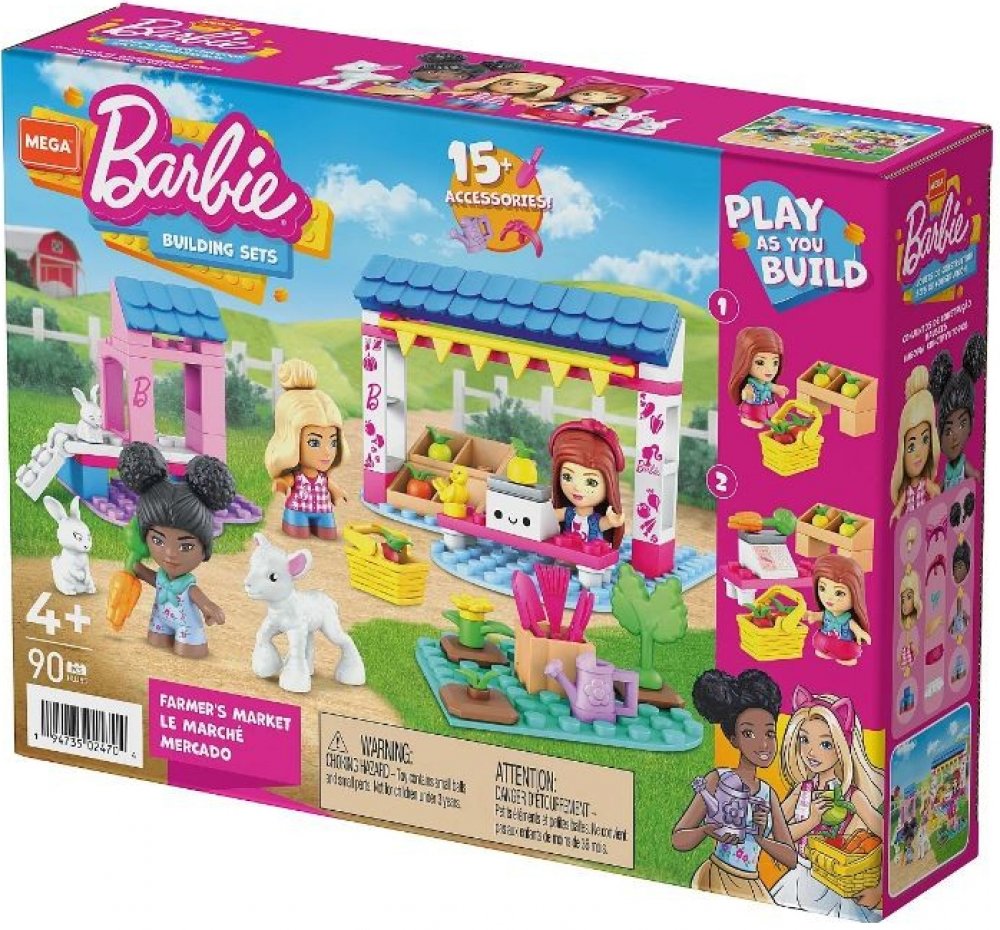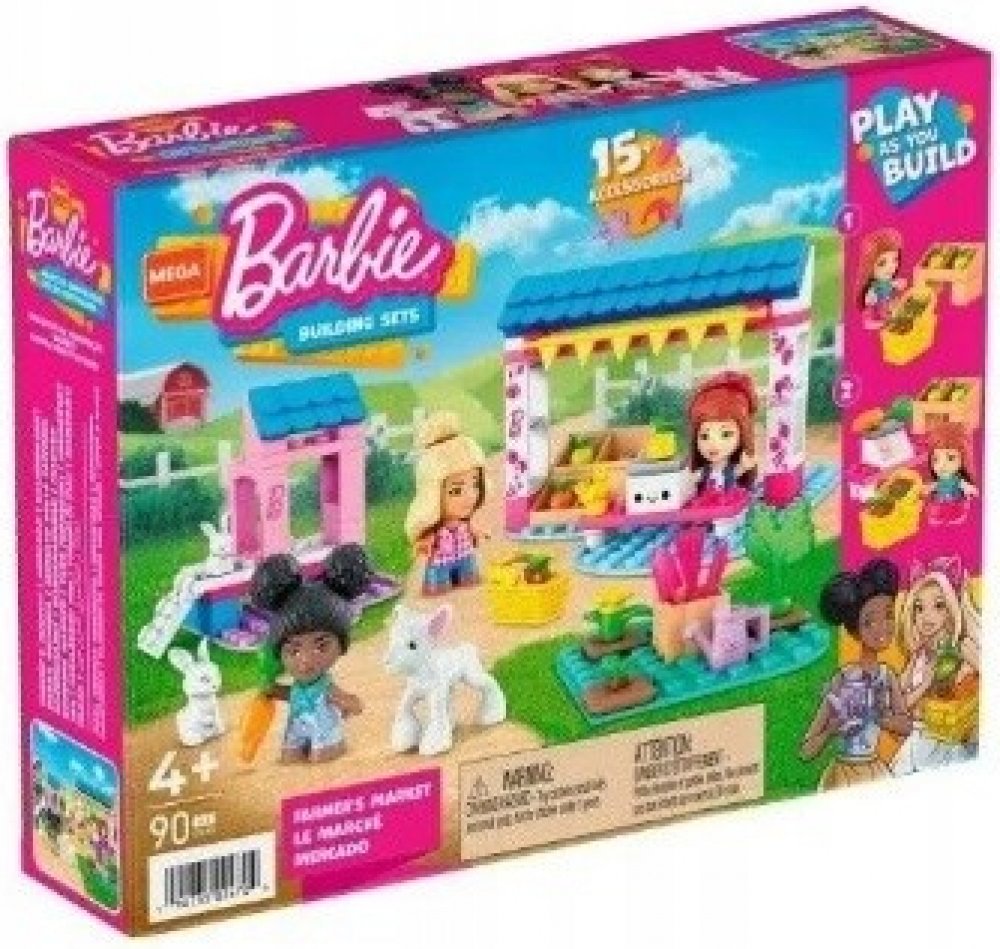 Zahraj si na dobrodružný den na trhu a pomoz 3 mikrobábikám Barbie otevřít stánek. Malí farmáři se mohou bavit budováním zahrady a sázením plodin. Pak už jen stačí postavit stánek se zeleninou a postavit se k pokladně, aby mohly začít prodávat svou úrodu. Postarej se o ptáčky, králíčky a ovečky, a navíc postav králíkárnu. Tato stavebnice se snadno sestavuje a poskytuje lahodnou zábavu v každé fázi stavby. Stavební hračky Wonder Builders byly vytvořeny s ohledem na malé stavitele od 4 let.Pomocí 6 módních doplňků můžete vylepšit styl mikro panenek. Můžete se bavit stavěním zahrádky, domečku pro králíčky a stánku se zeleninou, které dokonale doplňují doplňky, jako je zelenina, pokladna a další.Kostky jsou kompatibilní se všemi stavebnicemi MEGA Barbie a kostkami dalších předních značek. Tím, že si děti mohou stavět samy, rozvíjejí svou kreativitu a schopnost řešit problémy.Sada obsahuje: obsahuje: 3 mikro panenky Barbie, 4 zvířátka, 80 kostek se speciálními prvky a doplňky a 3 základny ve tvaru srdce, na kterých lze stavět. Můžeš si postavit stánek se zeleninou a pomáhat i za pokladnou. Také můžeš postavit domeček i pro zajíčka a postarat se o všechny milá zvířátka. Balení obsahuje 90 dílků. Popis produktu:Na farmářském trhu mohou děti pomoci 3 mikrobábikám Barbie prodávat jejich zboží. Malí farmáři si hrají podle svých představ, když zdobí zahrádku a sázejí plodiny. Pak mohou postavit stánek se zeleninou a přiložit pomocnou ruku za pokladnou. Když postaví králíkárnu, mohou se starat o ptáčka, pár králíčků a jehňátko zároveň. Tato stavebnice je určena pro začínající stavitele a snadno se sestavuje. V každém kroku stavění můžete vymýšlet a přehrávat ty nejroztomilejší příběhy. Hračky Wonder Builders ke stavění jsou určeny pro malé kutily od 4 let