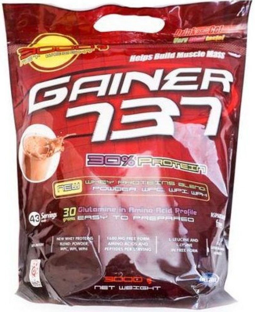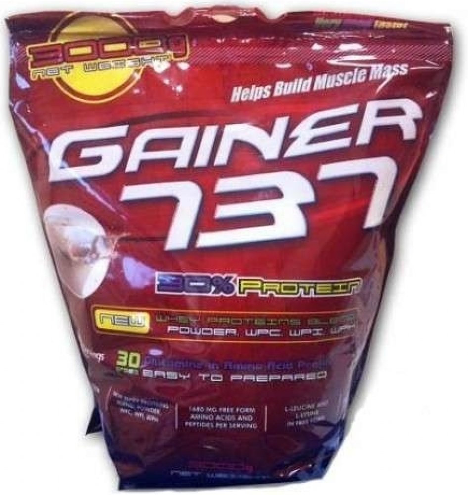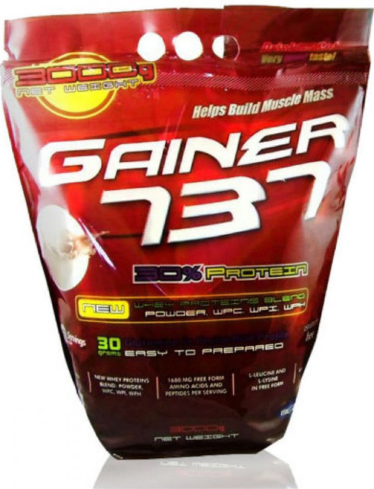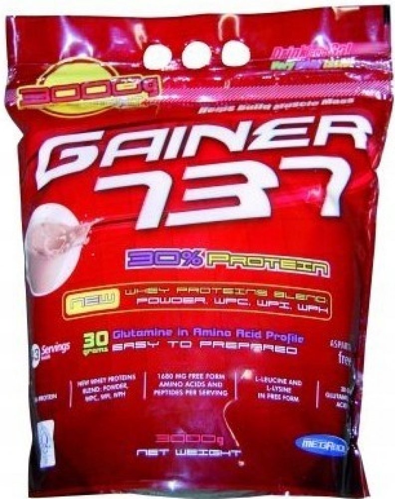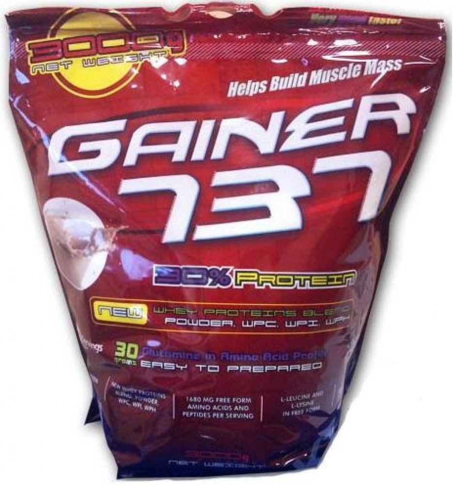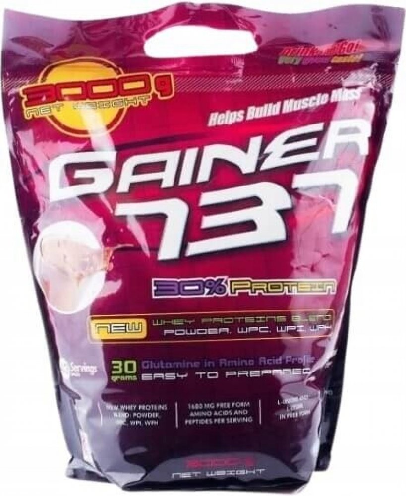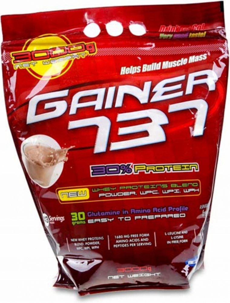 Gainer 737 získal status nejprodávanějšího Gaineru na trhu, a to díky jeho užitečným vlastnostem. Jeho základním rysem je výrazná chuť a rozmanitost příchutí, avšak jeho největším plusem je procentuální zastoupení bílkovin na jednu dávku. Přibližně v 100 g výroku najdete až 30 % bílkovin, které jsou získány ze syrovátky WPI, WPC a WPH, izolované bílkoviny z pšeničných klíčků, která je bohatým zdrojem L-glutaminu. Kromě toho obsahuje i čisté, volné aminokyseliny L-lucein a L- lysin. Ve srovnání s konkurenčními gainery je 30% bílkovin opravdu obdivuhodné číslo v poměru k jeho ceně. Gainer 737 od Společnosti Megabol má na Slovensku trhu opravdu nezastupitelné místo a z roku na rok je tento Gainer populárnější a prodávanější.