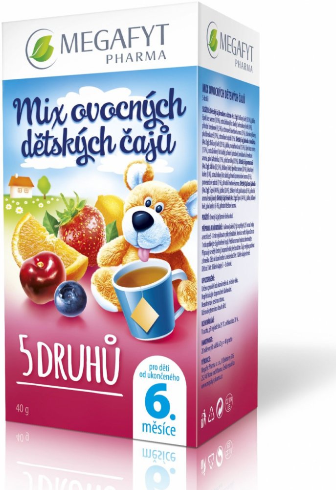 Megafyt Mix ovocných čajů je směs 4 druhů dětských aromatizovaných čajů ze směsi sušených bylin a ovoce příjemné vůně a chuti. Určeno pro děti od ukončeného 6. měsíce věku. Porcované.
