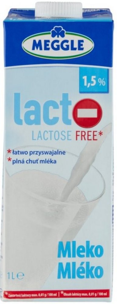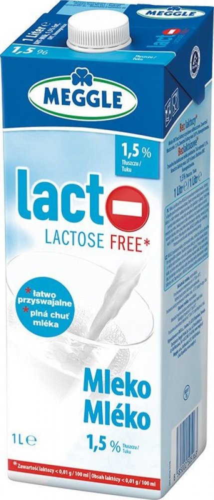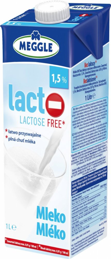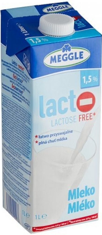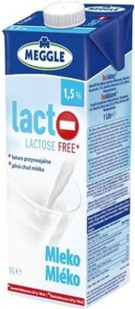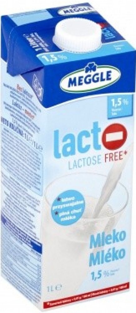 Trvanlivé bezlaktózové mléko Meggle. Polotučné. Přírodní kvalita bez mléčného cukru. Díky štěpení laktózy získává bezlaktózové mléko Meggle lehce sladkou chuť. Nejen skvěle chutná, ale poskytuje všechny přírodní složky, jež obsahují běžná mléka: vápník, bílkoviny a tuky. Cena za ks..