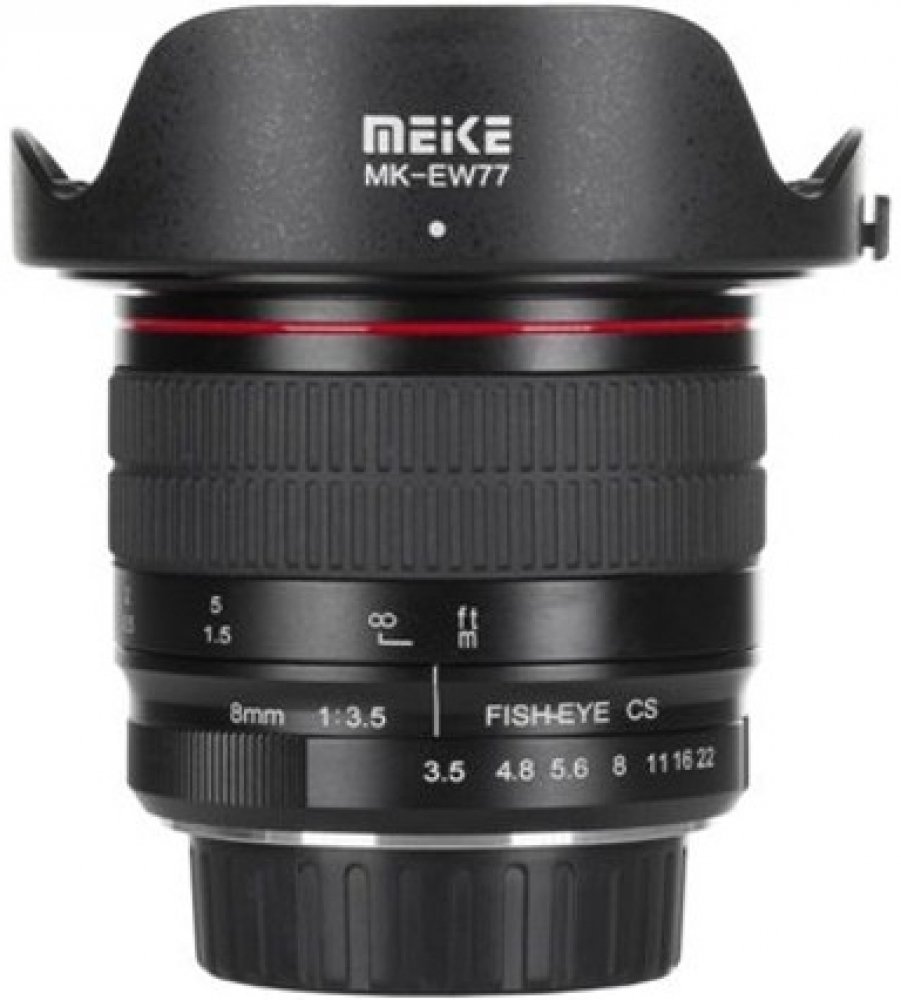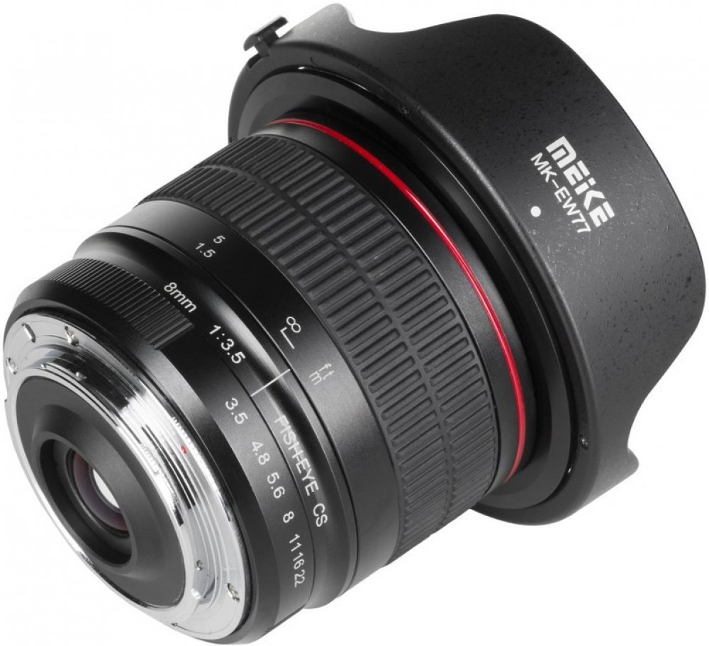 Meike 8mm f3,5 - Meike 8mm - je novinka od firmy Meike. Zaostřování je manuální. Objektiv je vyroben z odolné kovové slitiny s matnou povrchovou úpravou. Ekvivalent ohniskové vzdálenosti pro systém Sony E je 12mm. Čočky jsou potaženy vícevrstvou antireflexní vrstvou aby se minimalizoval výskyt záblesků a stínů. Objektiv se vyznačuje zvýšenou odolností proti pronikání prachu. Objektiv je určen pro fotoaparáty systému APS-C a díky odnímatelné sluneční cloně není problém používat i s fotoaparáty full-frame, kde je výsledný obraz 160 ve svislé a 200 stupňů v horizontální rovině. Je ideální pro fotografování krajiny i jiných neobvyklých záběrů. Součástí balení je odnímatelná sluneční clona a obě krytky.
