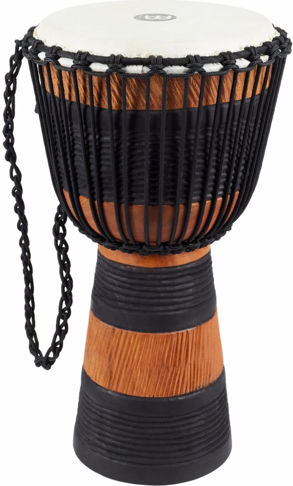 Djembe MEINL EARTH RHYTHM SERIES DJEMBEDjembe ze série Meinl Earth Rhythm Series jsou bubny vyráběné skutečně tradičními postupy. Největším rozdílem oproti běžným Djembe je způsob ladění, na které se nepoužívá kovový hardware sestávající z obručí, mušlí a ladících šroubů, ale promyšlený systém provazů. Kvalita těchto bubnů je samozřejmostí, ne nadarmo patří mezi jedny z nejoblíbenějších na trhu. Vyrobeno je z jednoho kusu výběrového dřeva mahagonu, na ozvučnou blána je použita pečlivě vybíraná kozí kůže – zcela ideální materiál pro dosažení vyrovnaného zvuku. Jeho průměr činí 10 palců a výška 20 palců, tvar je zcela tradiční, tudíž můžete očekávat i tradiční zvuk. K naladění slouží systém pětadvaceti 4 milimetrů silných provázků, které jsou zcela odolné proti vytažení, a tedy umožňují přesně naladit a ladění i udržet. Součástí kvalitní polstrovaný nylonový obal Meinl MDJB.