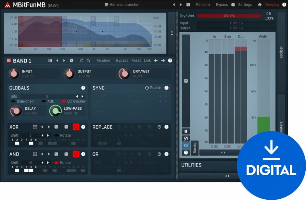 Zkreslení do extrému MBitFunMB je seriózní nástroj pro milovníky extrémního zkreslení. Konvertuje příchozí zvuk na data s omezenou přesností pevného bodu 1-16 bitů na vzorek a umožňuje vám přístup ke každému bitu pomocí několika operací bitové manipulace a zpracování ukončí low-pass filtrem. To vše s až 6 nezávislými frekvenčními pásmy, 4 modulátory... Od lehkého zkreslení až po maximální brutalit...