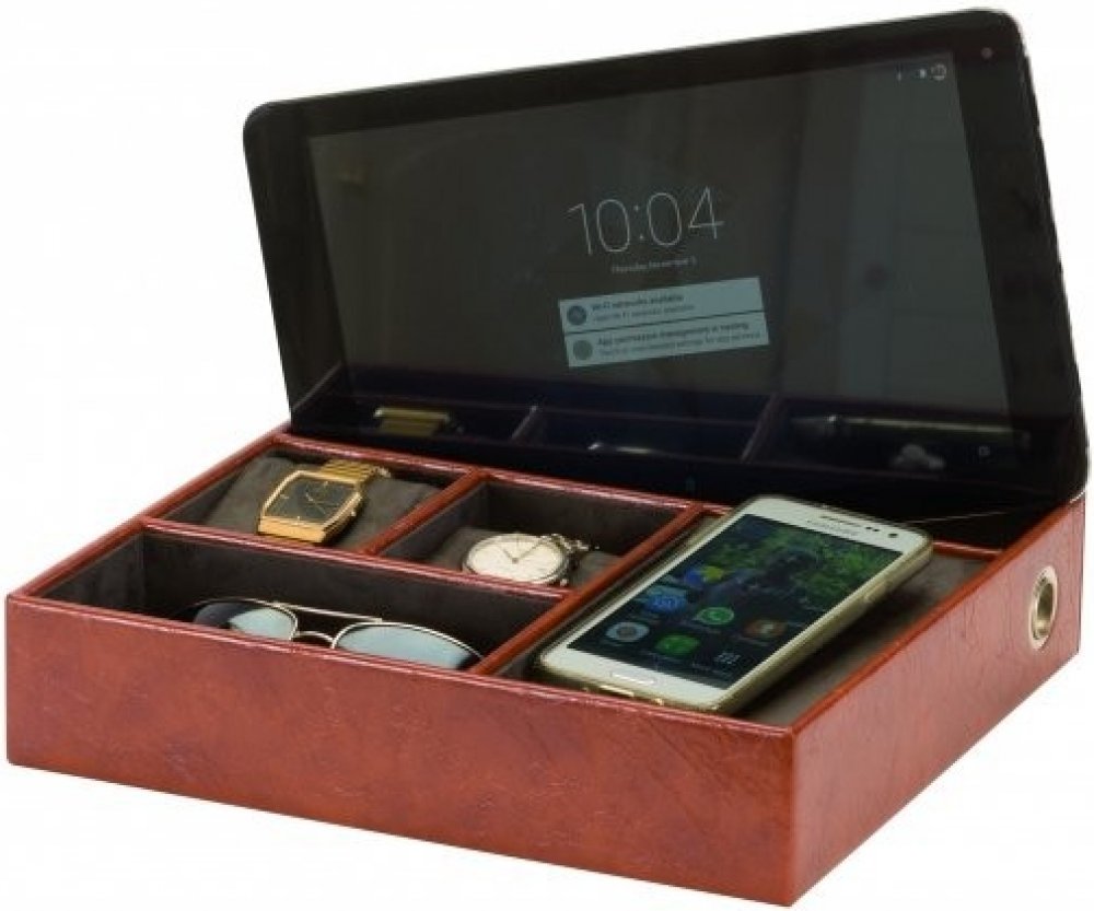 Elegantní otevřená šperkovnice pro moderního muže! V šperkovnici jsou dvě přihrádky s čalouněnými polštářky na hodinky, místo na odložení mobilu a tabletu, také jedna přihrádka na šperky či jiné drobnosti jako klíče, peníze atd. Na boku šperkovnice je otvor pro kabel, díky kterému můžete tablet nebo mobil pohodlně nabíjet.