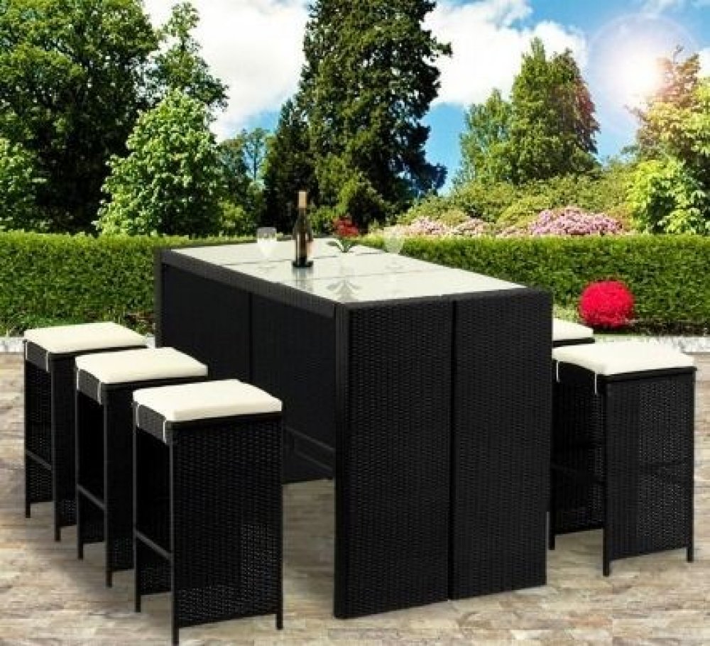 Bar set se skládá z velkého stolu 185cm, vč. Skleněných desek a 6 barových stoliček s polštáři a stupátka z hliníku.