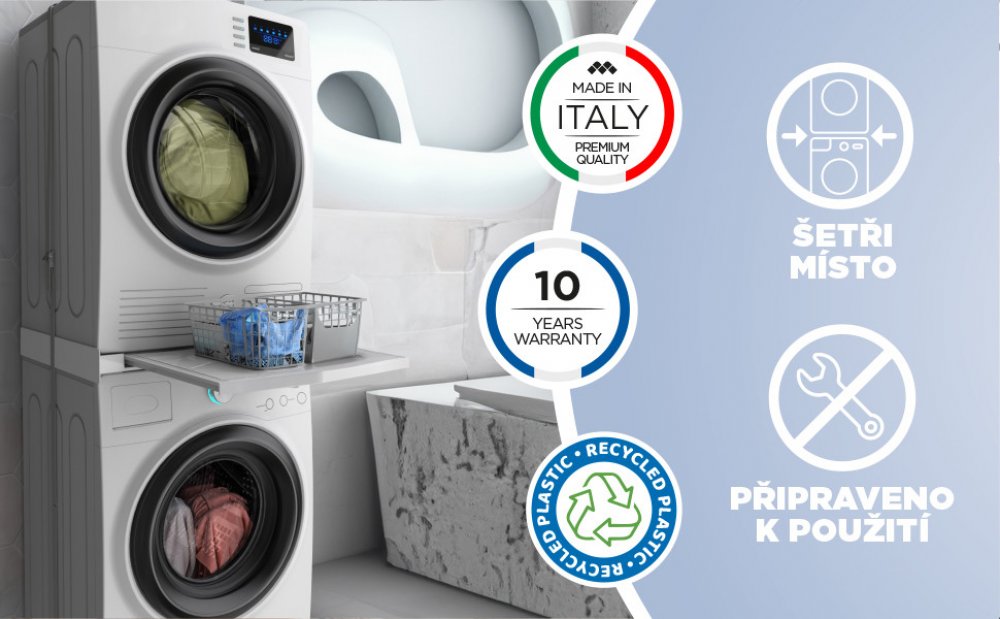 - univerzální mezikus mezi pračku a sušičku s výsuvnou policí, kompatibilní se všemi pračkami na trhu s hloubkou minimálně 45-70 cm a sušičkami s předním plněním s hloubkou 70 cm, 10 let záruka, Made in Italy, TUV, pevná technopolymerová struktura, bezpečnost zajištěna pásem s kovovou sponou, police s nosností 10 kg