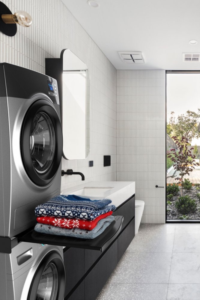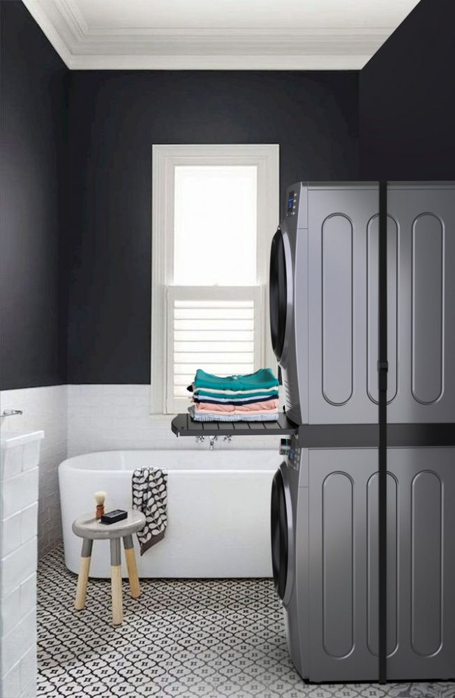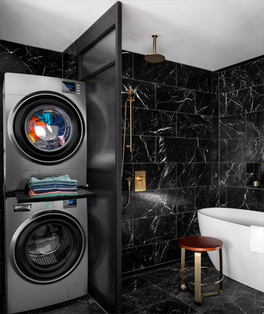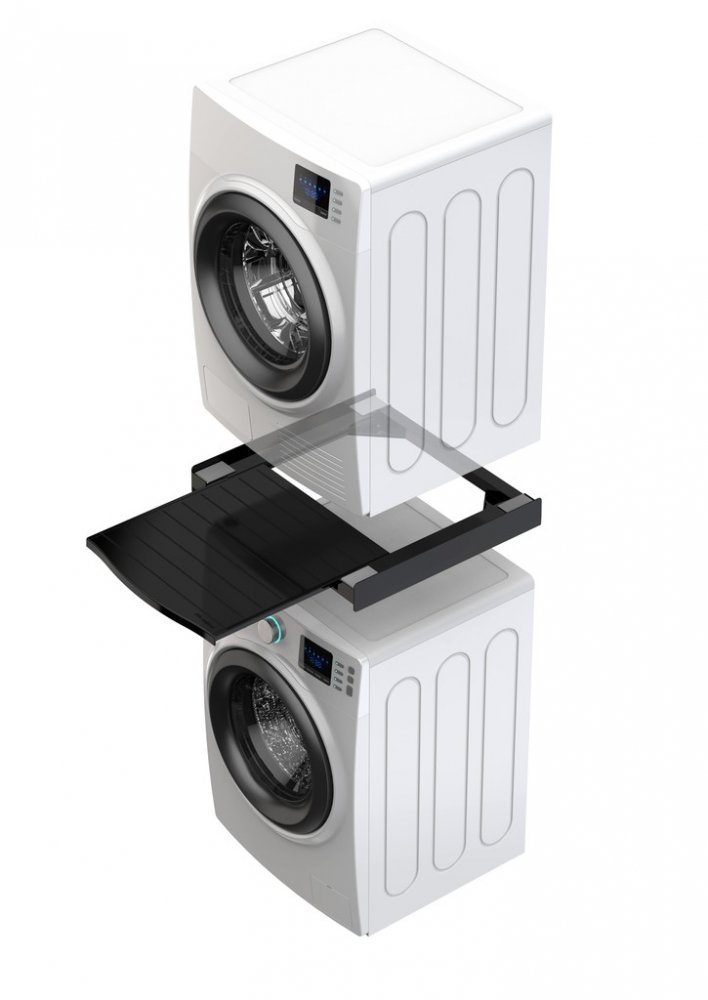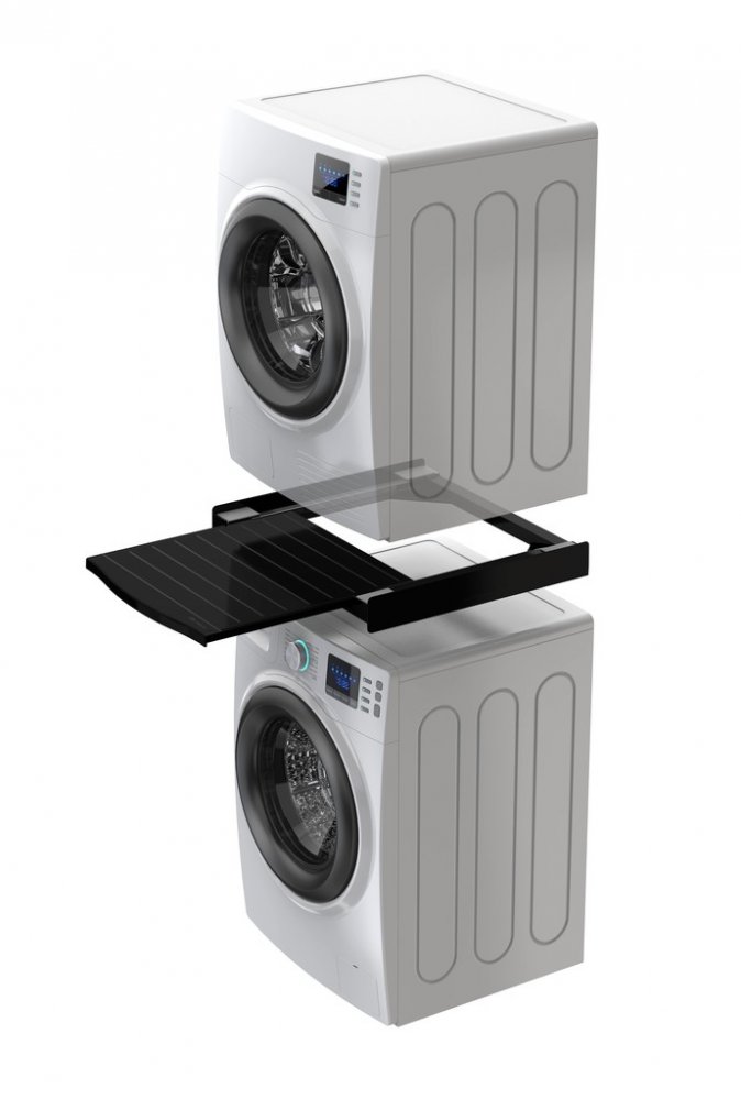 univerzální mezikus mezi pračku a sušičku s výsuvnou policí v černé barvě • kompatibilní se všemi pračkami na trhu s hloubkou minimálně 45–60 cm a sušičkami s předním plněním s hloubkou 70 cm • 10 let záruka • made in Italy • TUV • pevná technopolymerová struktura • bezpečnost zajištěna pásem s kovovou sponou • police s nosností 10 kg • maximální nosnost 250 kg