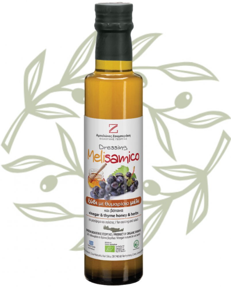 Vysoce kvalitní BIO vinný ocet MELISAMICO s tymiánovým medem a bylinkami, vyrobený ze 100% organicky pěstovaných bílých hroznů z Kréty. Obsahuje tymián, šalvěj, majoránku, meduňku a oregano. Vyniká harmonickou chutí a jemným aroma, které dodá pokrmům středomořský charakter. Zraje tradičně v dubových sudech a hodí se do salátů, marinád i moderní kuchyně.
