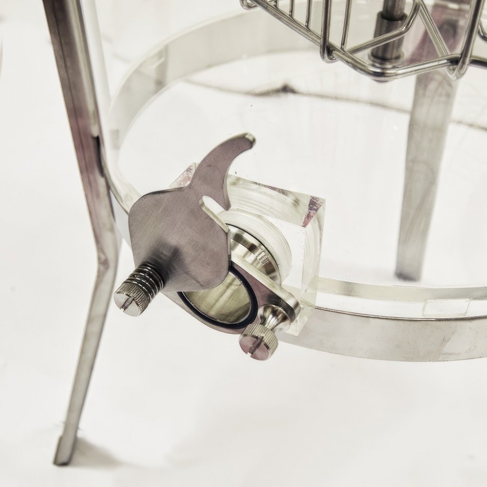 má buben z plexiskla, ostatní součásti jsou z nerezu. Výpustný kohout je plastový, lze jej snadno