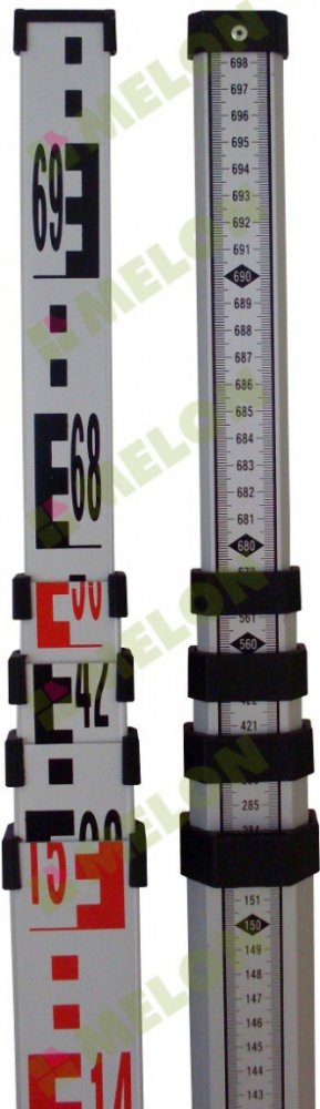 Nivelační lať 7m je profesionální teleskopická nivelační lať. Na přední straně stupnice má centimetrové dělení 0–7m ( tak zvané E ), zadní strana latě má milimetrovou stupnici 0–7m. Ve složeném stavu měří 1,67m. Ochranný obal s popruhem přes rameno je součástí balení. Doporučené příslušenství :