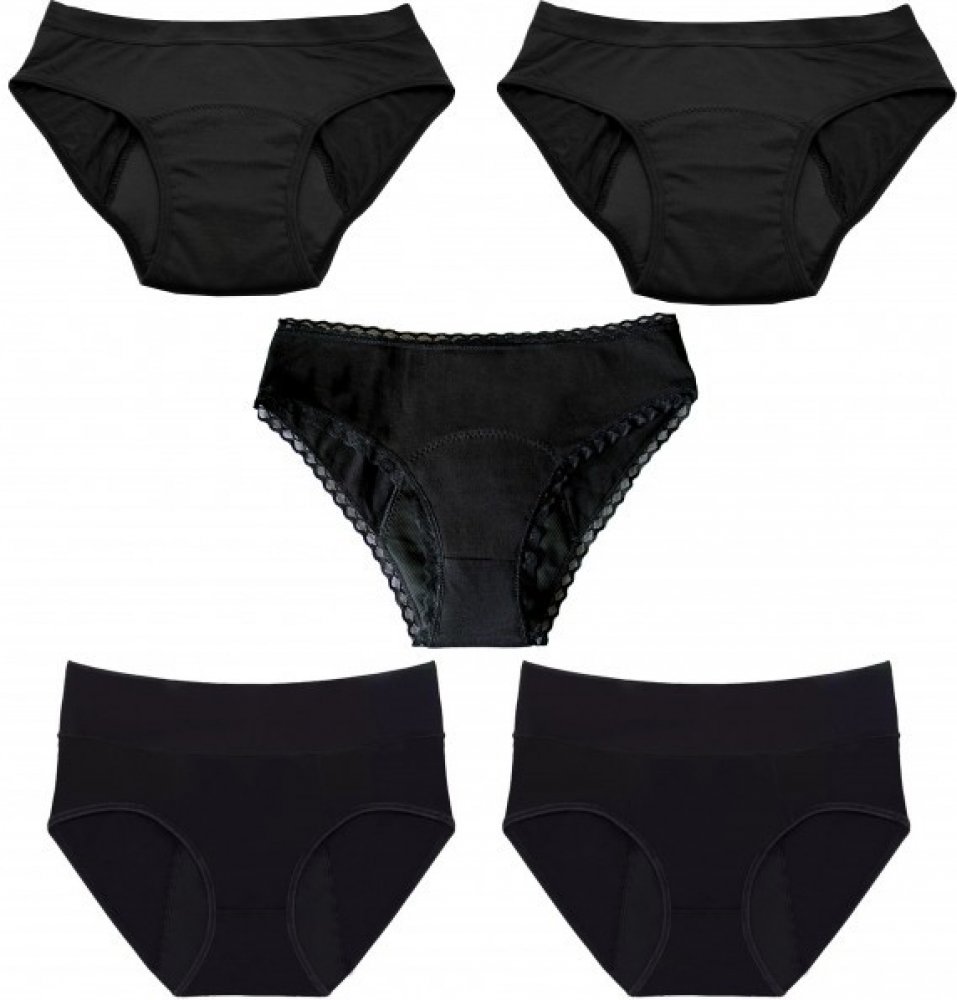 Výhodný balíček menstruačních kalhotek obsahuje 5 kusů: 2x Midi, 2x Full a 1x Bezešvé. Typ Full je vhodný pro silnou menstruaci, typ Midi je pro střední menstruaci a Bezešvé pro extra silnou menstruaci. Díky skvělému zpracování neprotečou.Níže jsou uvedeny velikosti kalhotek, pružnost a popis pro snadnější výběr. Nabízíme možnost výměny/vrácení do 14 dnů.Obsahují 4 vrstvy ochrany, které jsou lehké, prodyšné a spolehlivé.Jsou super tenké, ale přesto absorpční.Použité materiály jsou funkční a prodyšné, což zajišťuje odvod vlhkosti od těla a udržuje vás suché.Jsou pohodlné, nešustí a zcela diskrétní pod oblečením.Mají certifikaci Öko-Tex 100, což zaručuje kvalitu a bezpečnost.Můžete je nosit samostatně nebo jako zálohu k jiným menstruačním produktem, například ke kalíšku, tamponům nebo menstruačním houbám.Jsou vhodné pro každodenní nošení nebo na noc.Po vyprání je můžete opět použít, což šetří životní prostředí i vaše výdaje.Midi kalhotky jsou vyrobeny z příjemného přírodního materiálu bambusové viskózy. Jsou vhodné pro středně silnou menstruaci a absorbují 20-30 ml tekutiny. Složení kalhotek je následující: vnější a vnitřní vrstva - 95% bambusová viskóza, 5% spandex, střed - 80% polyester, 20% nylon.Full kalhotky jsou vyrobeny z příjemné bavlny a jsou vhodné pro silnou menstruaci. Mají vyšší pas a absorbují 30-35 ml tekutiny. Složení kalhotek je následující: Vnější vrstva: 95 % bavlna, 5 % spandex. Vnitřní: 100 % rychloabsorpční polyester. Střed: 80 % polyester, 20 % nylon, prodyšný polyuretan.Bezešvé kalhotky absorbují 45–50 ml. Vnější vrstva: 78 % nylon, 22 % spandex; střed: 100 % polyester (prodyšná polyuretanová vrstva); vnitřní vrstva: 80 % polyester, 20 % nylon Údržba: Pro správnou údržbu kalhotek je doporučeno před prvním použitím je vyprat. Můžete je prát s podobnými barvami v jemném programu pracího cyklu. Nepoužívejte aviváž ani bělidlo. Kalhotky nechte uschnout na vzduchu, nesušte je v sušičce ani je nežehlete. Při správné péči mají kalhotky stejnou životnost jako běžné spodní prádlo.Velikost: Pas Boky (cm)XS 64-68 85 -90S 69-73 91-96M 74-79 97-102L 80-85 103-108XL 86-91 109-114XXL 92-97 115-120XXXL 98-104 121-125