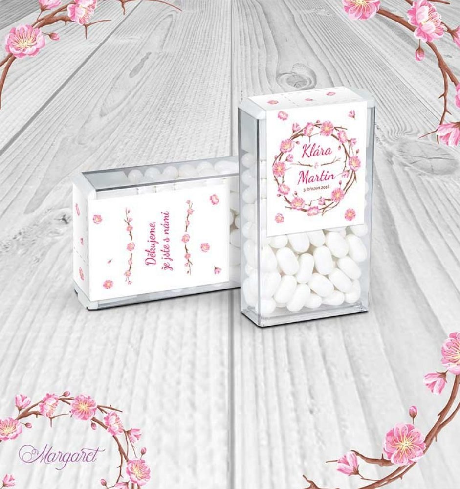 Krabička osvěžujících dražé bonbónků s etiketou ve stylu Vaší svatby, ideální na sladký bar nebo jen tak na svatební stoly.