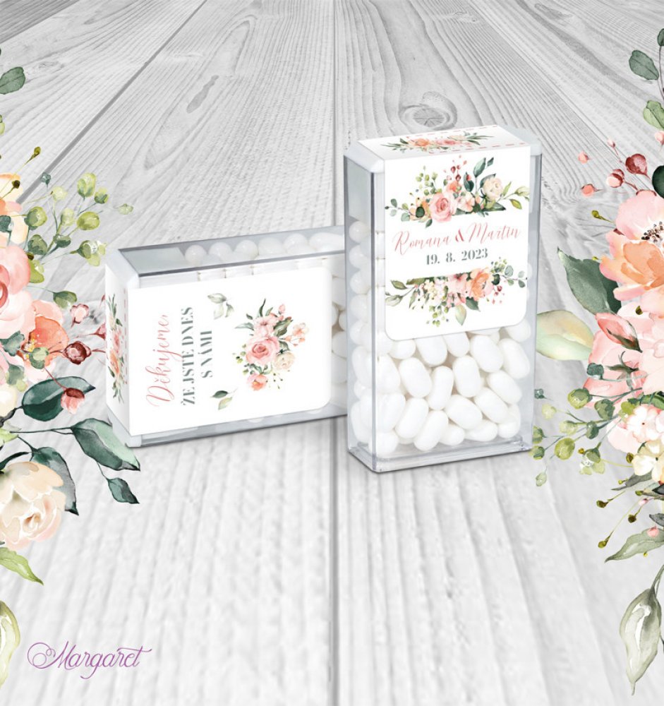 Krabička osvěžujících dražé bonbónků s etiketou ve stylu Vaší svatby, ideální na sladký bar nebo jen tak na svatební stoly.