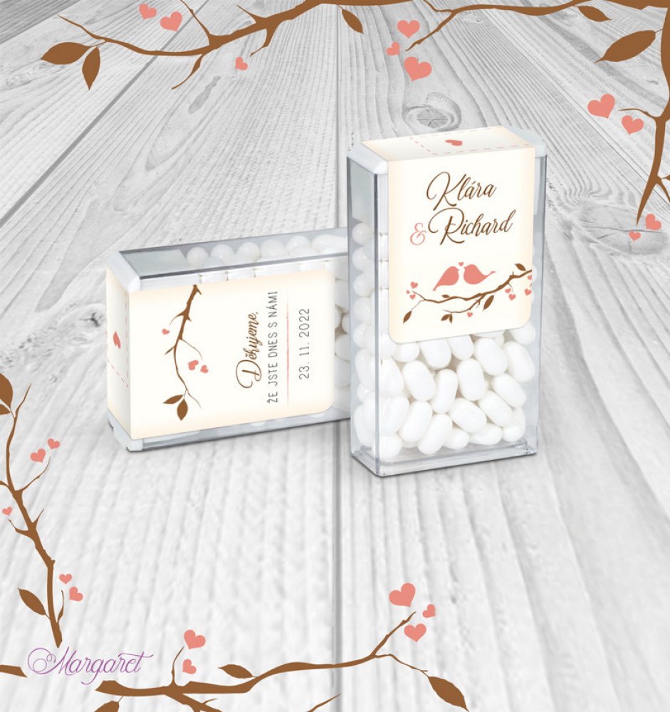 Krabička osvěžujících dražé bonbónků s etiketou ve stylu Vaší svatby, ideální na sladký bar nebo jen tak na svatební stoly.