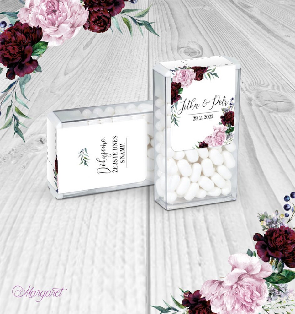 Krabička osvěžujících dražé bonbónků s etiketou ve stylu Vaší svatby, ideální na sladký bar nebo jen tak na svatební stoly.