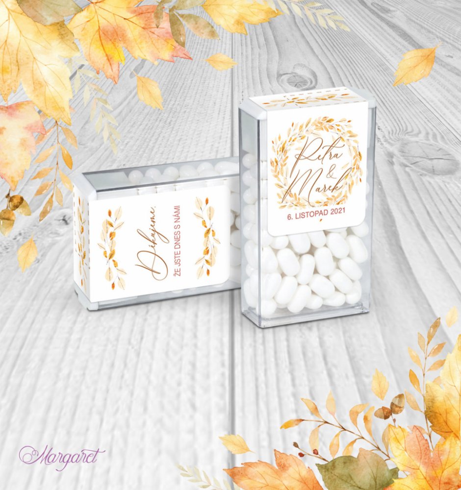 Krabička osvěžujících dražé bonbónků s etiketou ve stylu Vaší svatby, ideální na sladký bar nebo jen tak na svatební stoly.