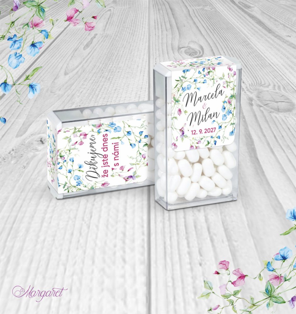 Krabička osvěžujících dražé bonbónků s etiketou ve stylu Vaší svatby, ideální na sladký bar nebo jen tak na svatební stoly.