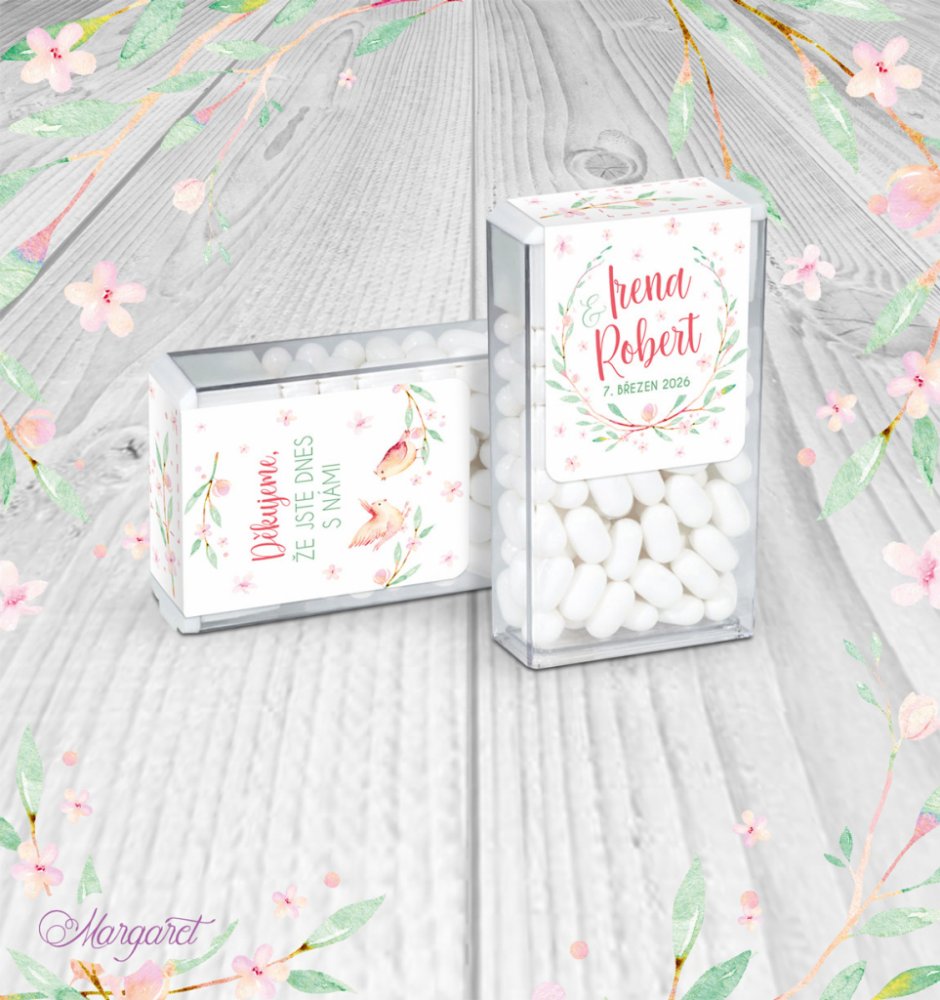 Krabička osvěžujících dražé bonbónků s etiketou ve stylu Vaší svatby, ideální na sladký bar nebo jen tak na svatební stoly.